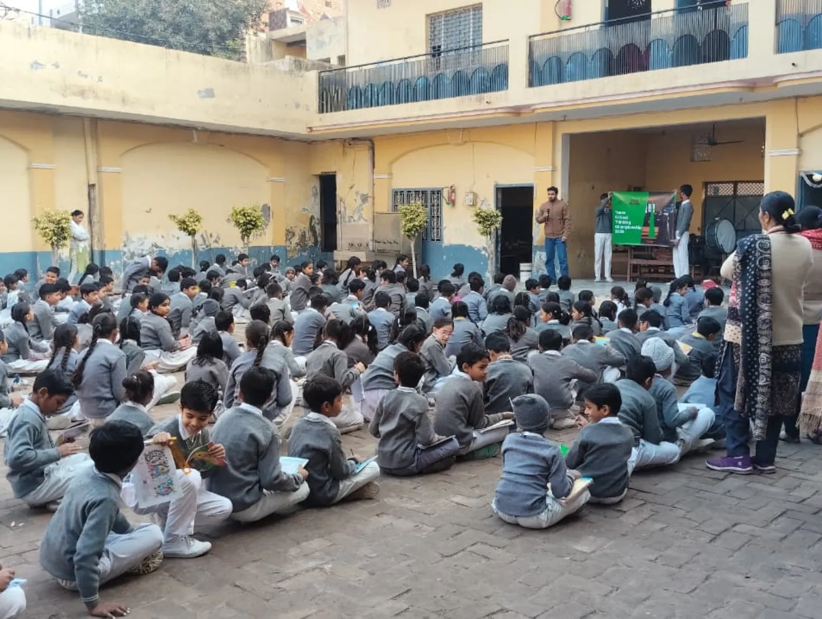 A trainer speaks to students during a Times Critical Thinking Championship 2026 outdoor school session.