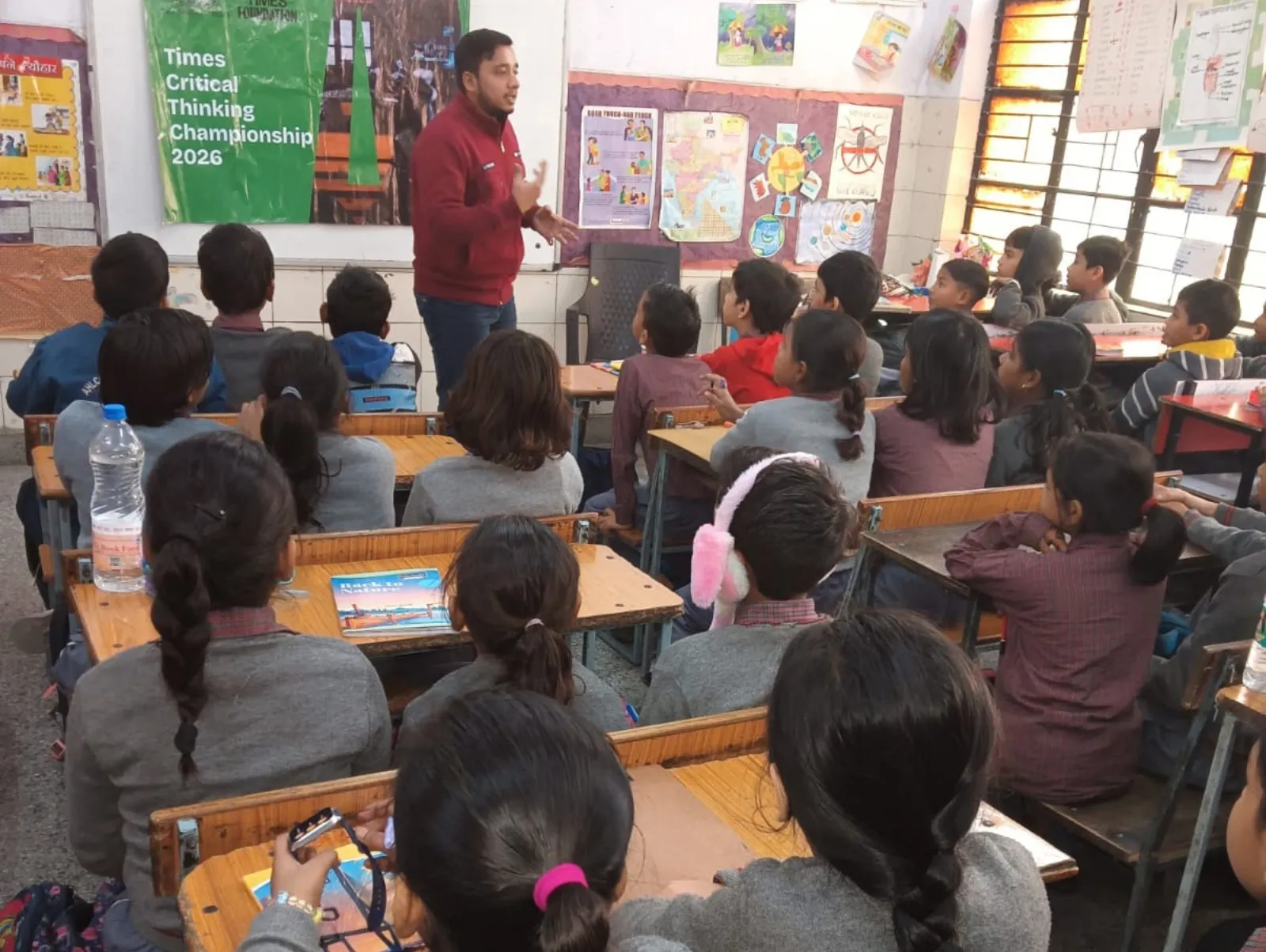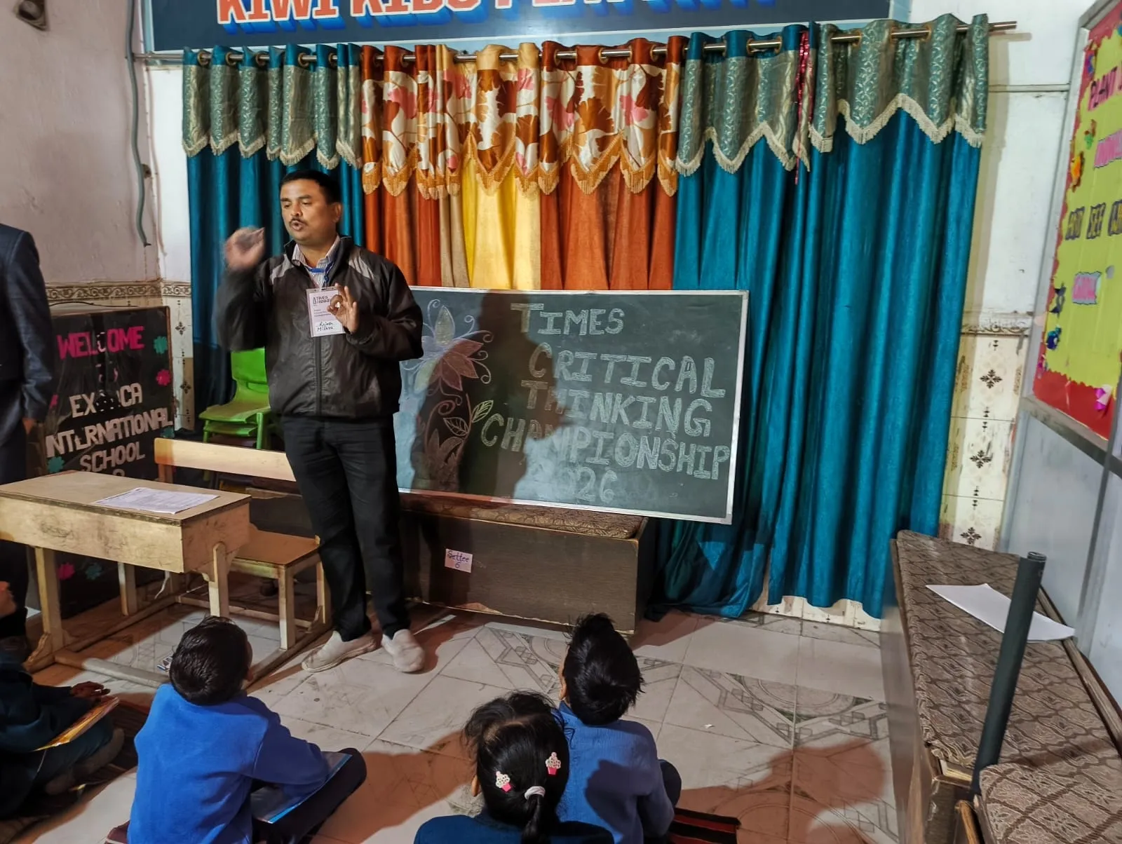 A trainer introduces the Times Critical Thinking Championship 2026 to young students in a decorated classroom.