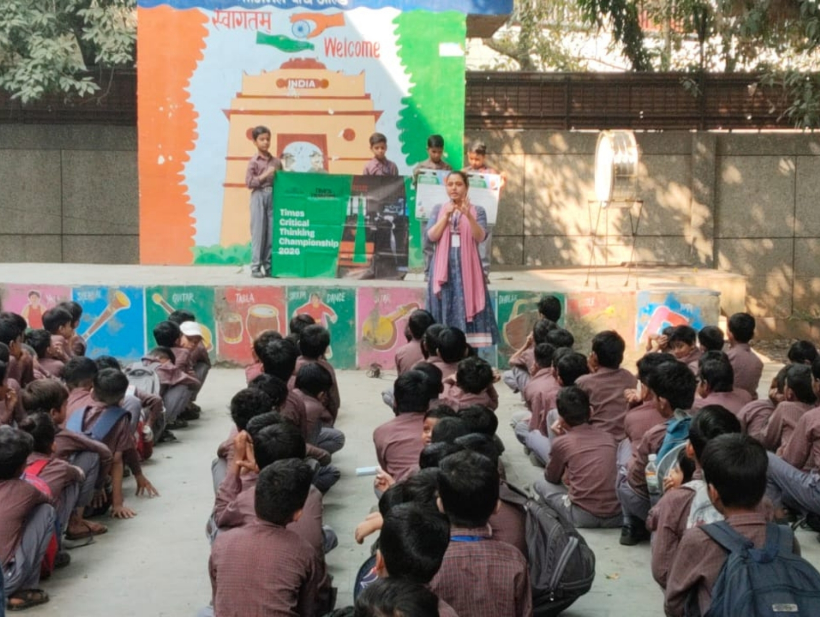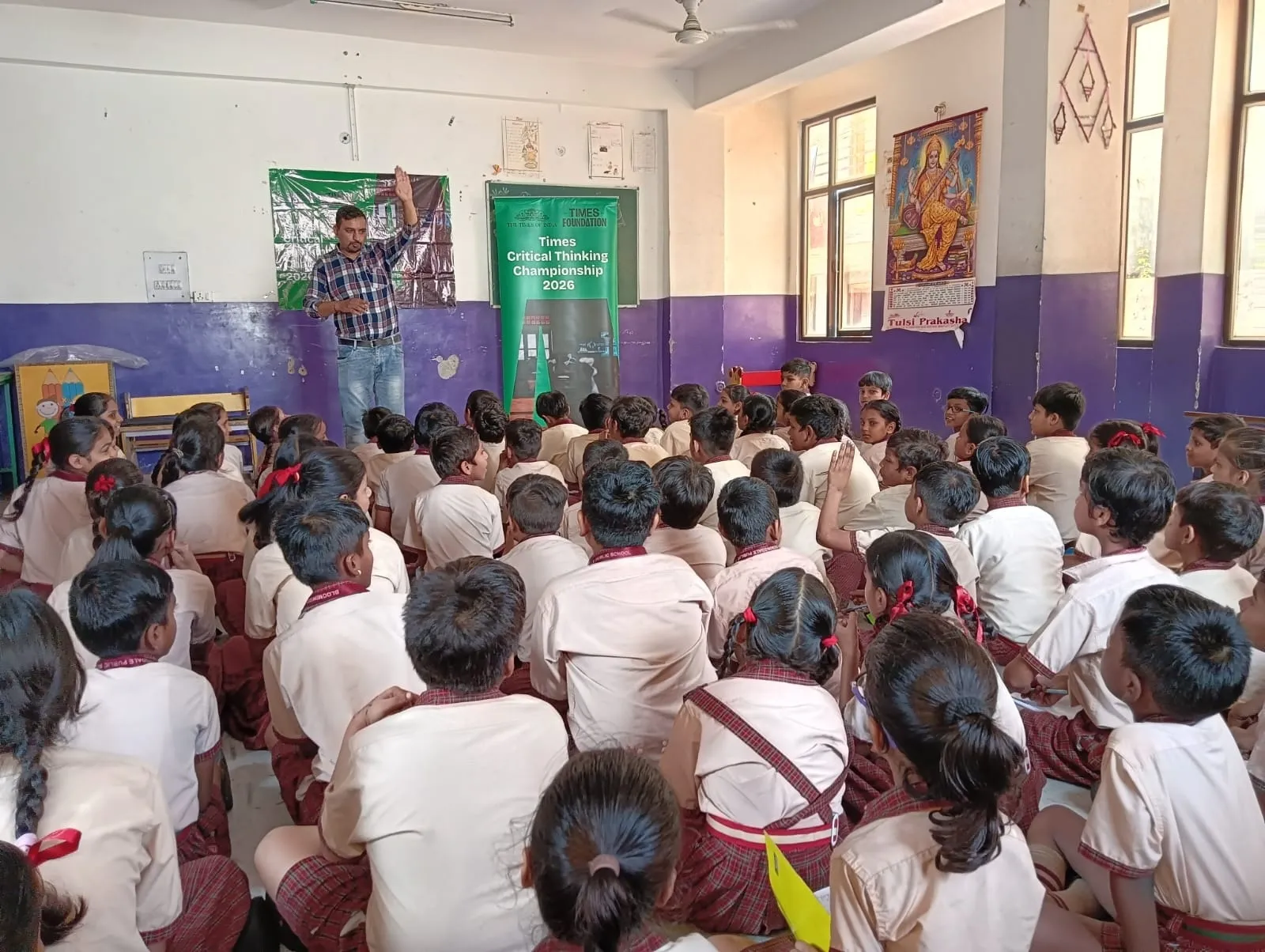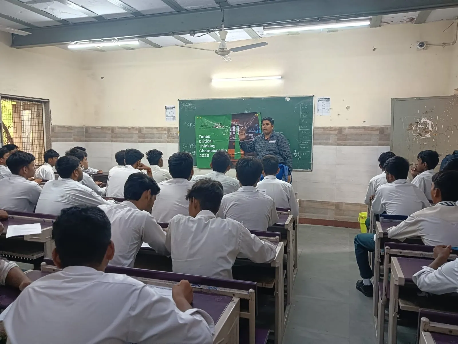 A trainer conducts a Times Critical Thinking Championship 2026 session for students in a government school classroom.