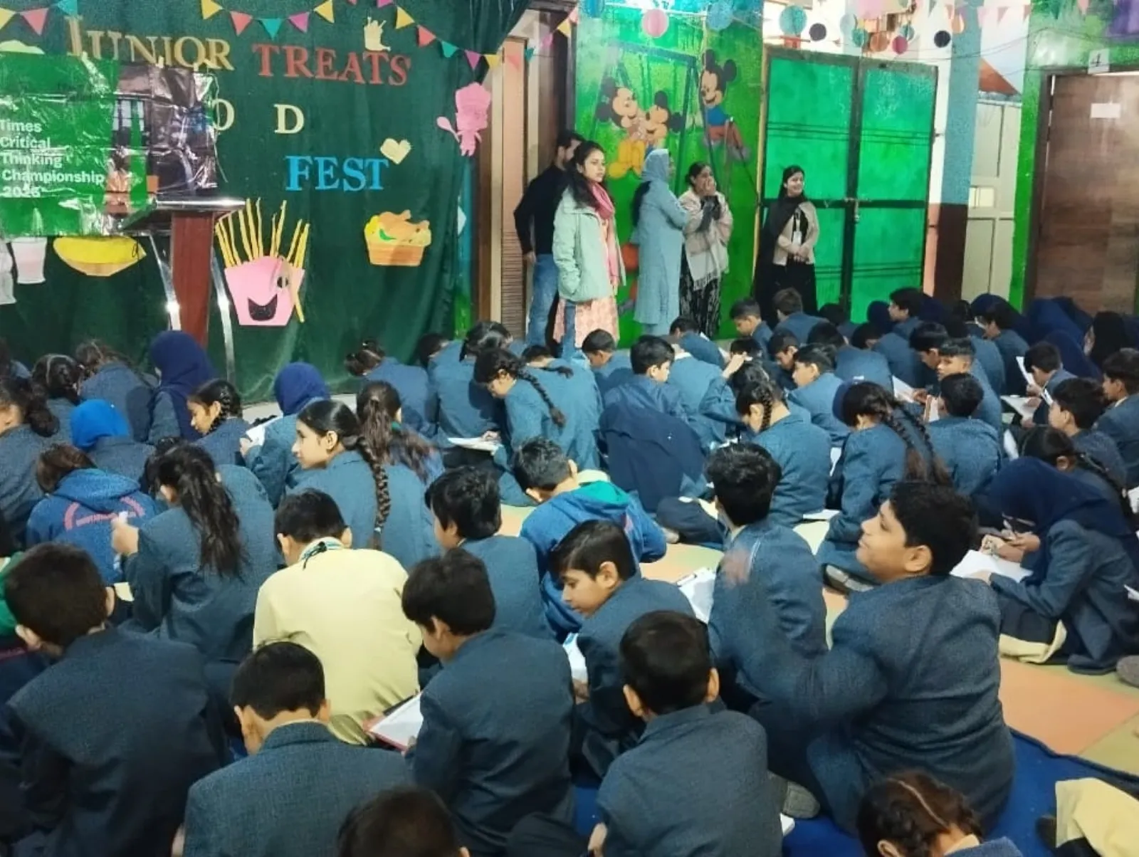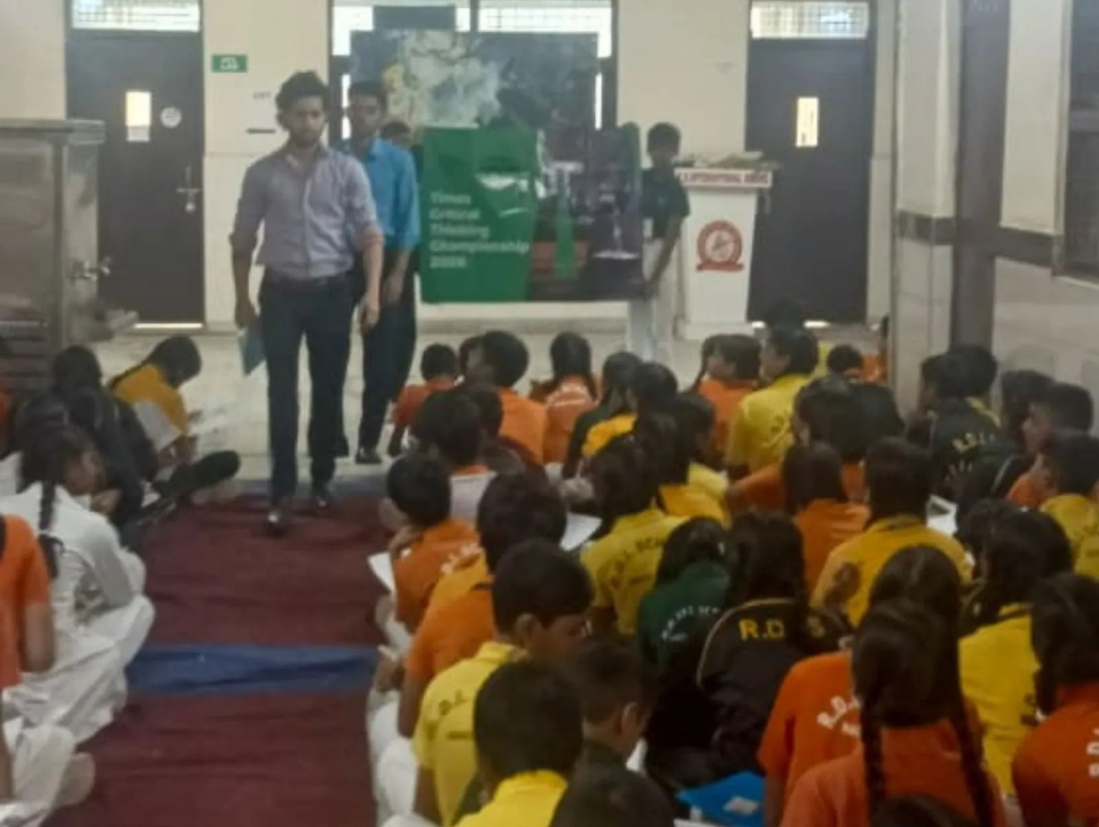 Trainers oversee a Times Critical Thinking Championship 2026 quiz session with students in a school hall.