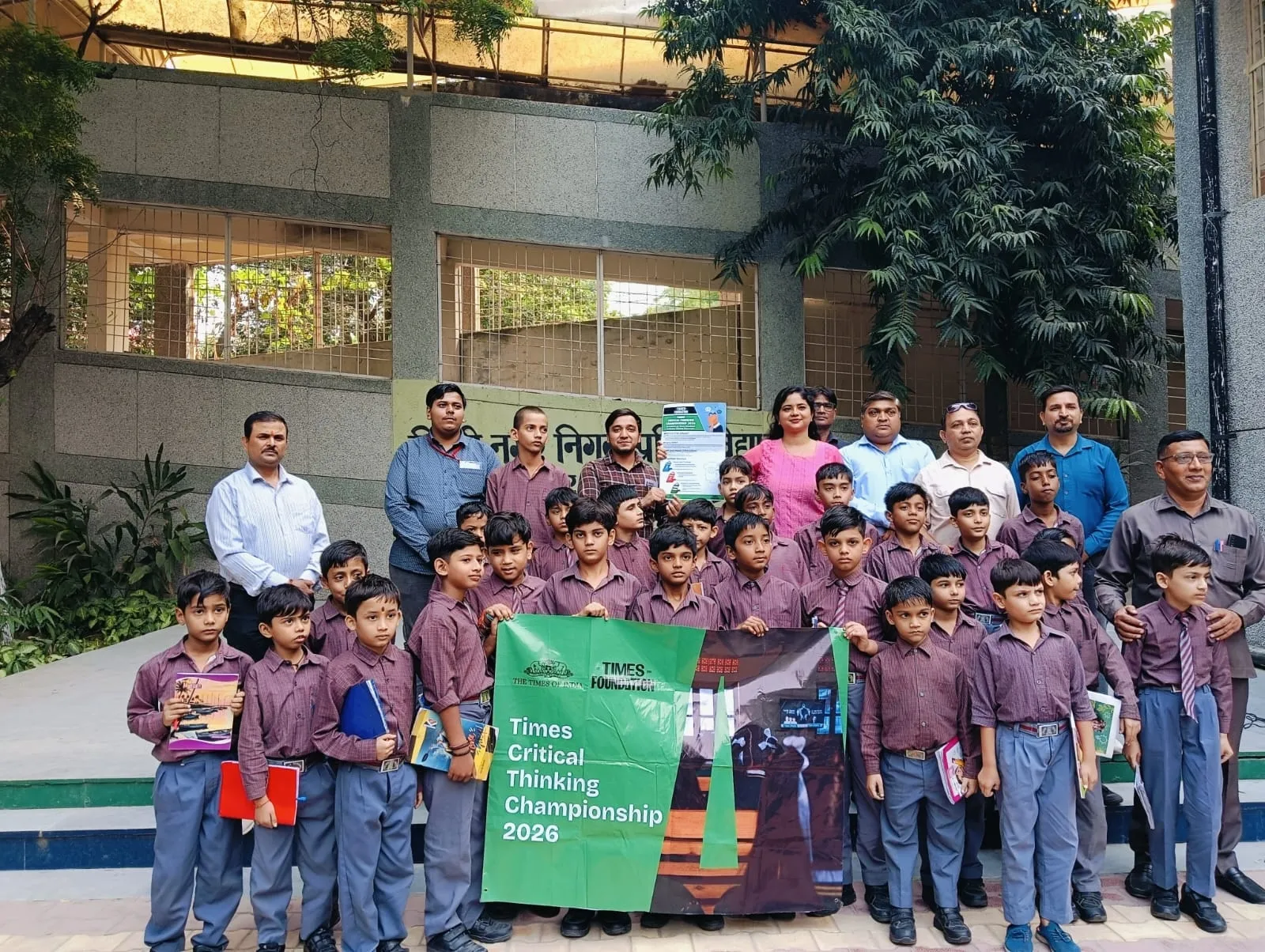 Students and staff pose with the Times Critical Thinking Championship 2026 banner outside their school.