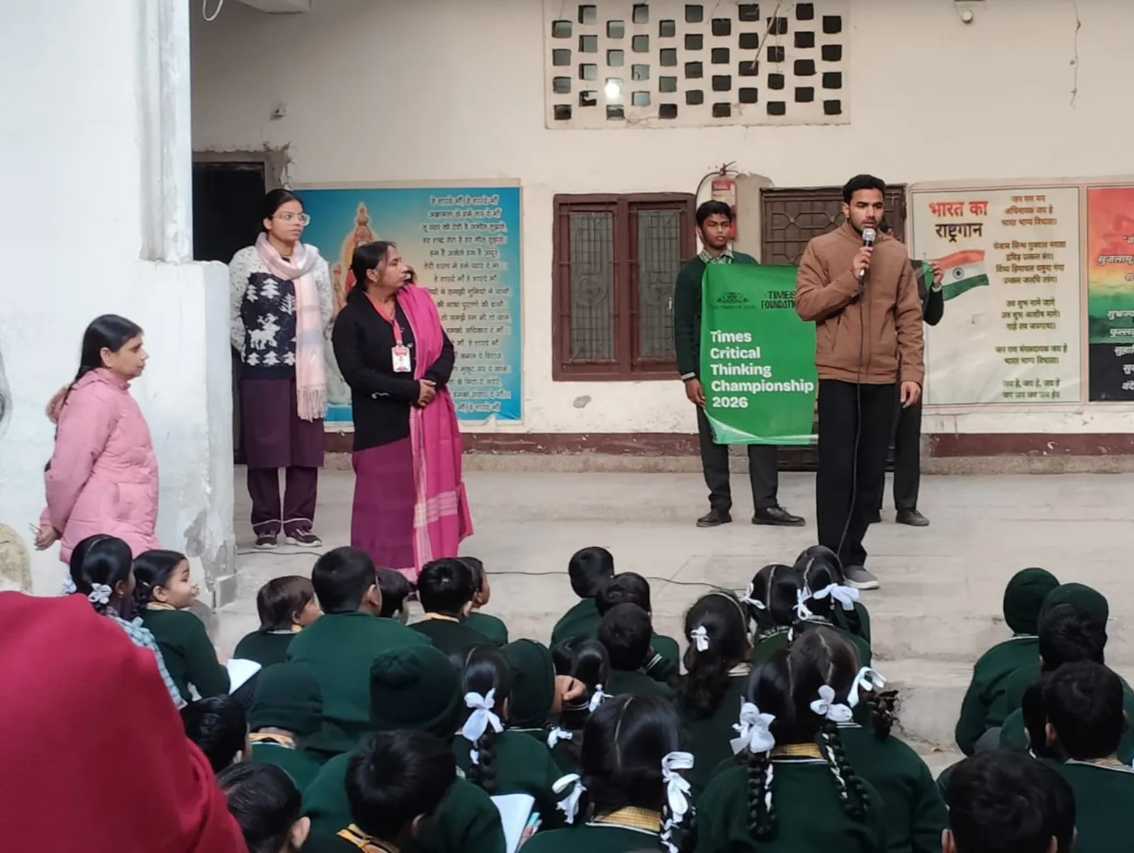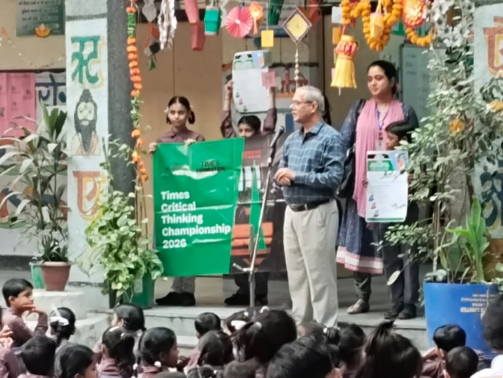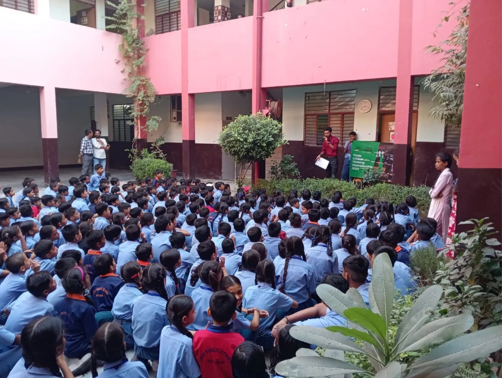 A trainer presents the Times Critical Thinking Championship 2026 at an outdoor school courtyard assembly.
