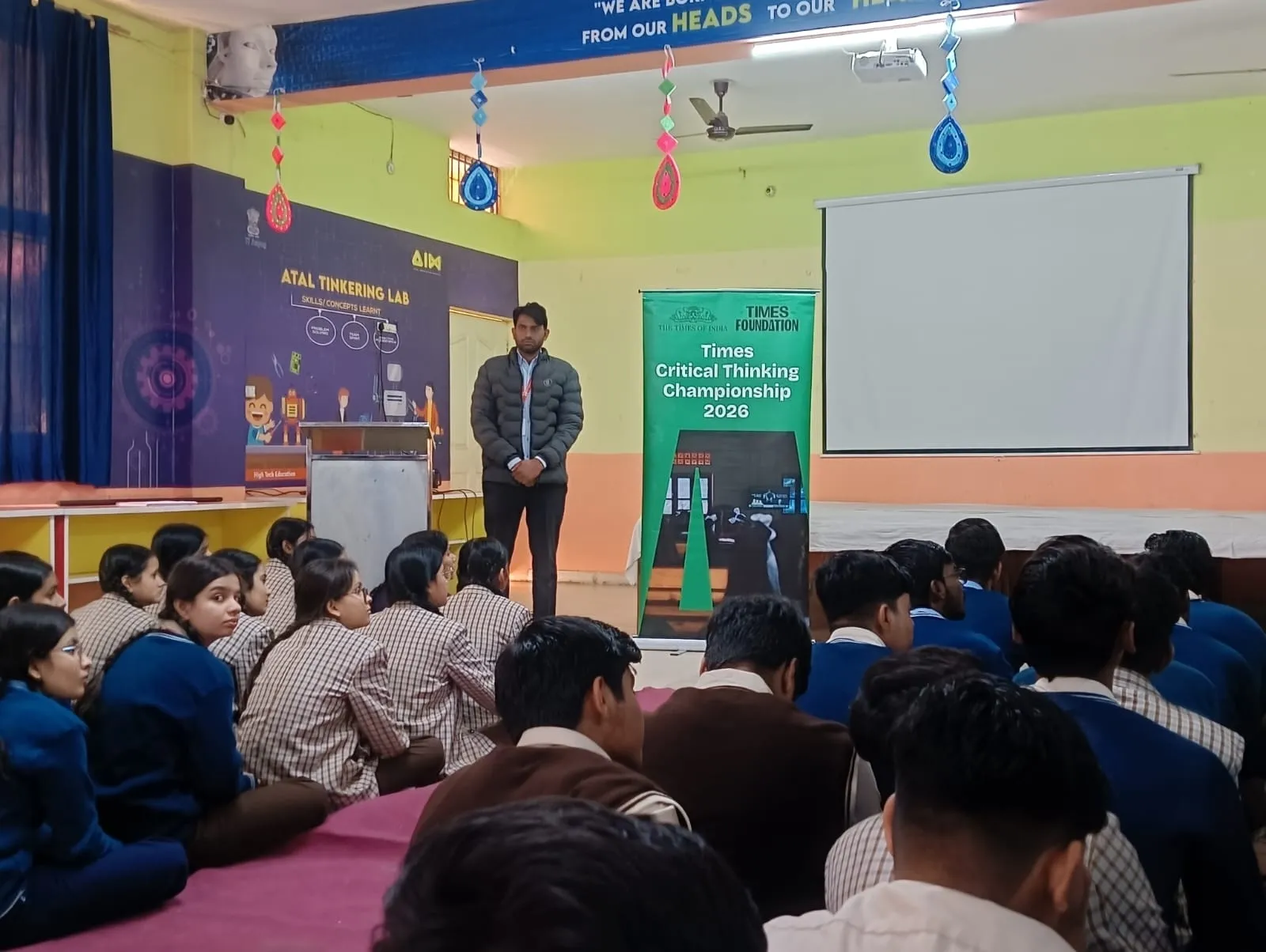 A trainer presents the Times Critical Thinking Championship 2026 to students in a school Atal Tinkering Lab.