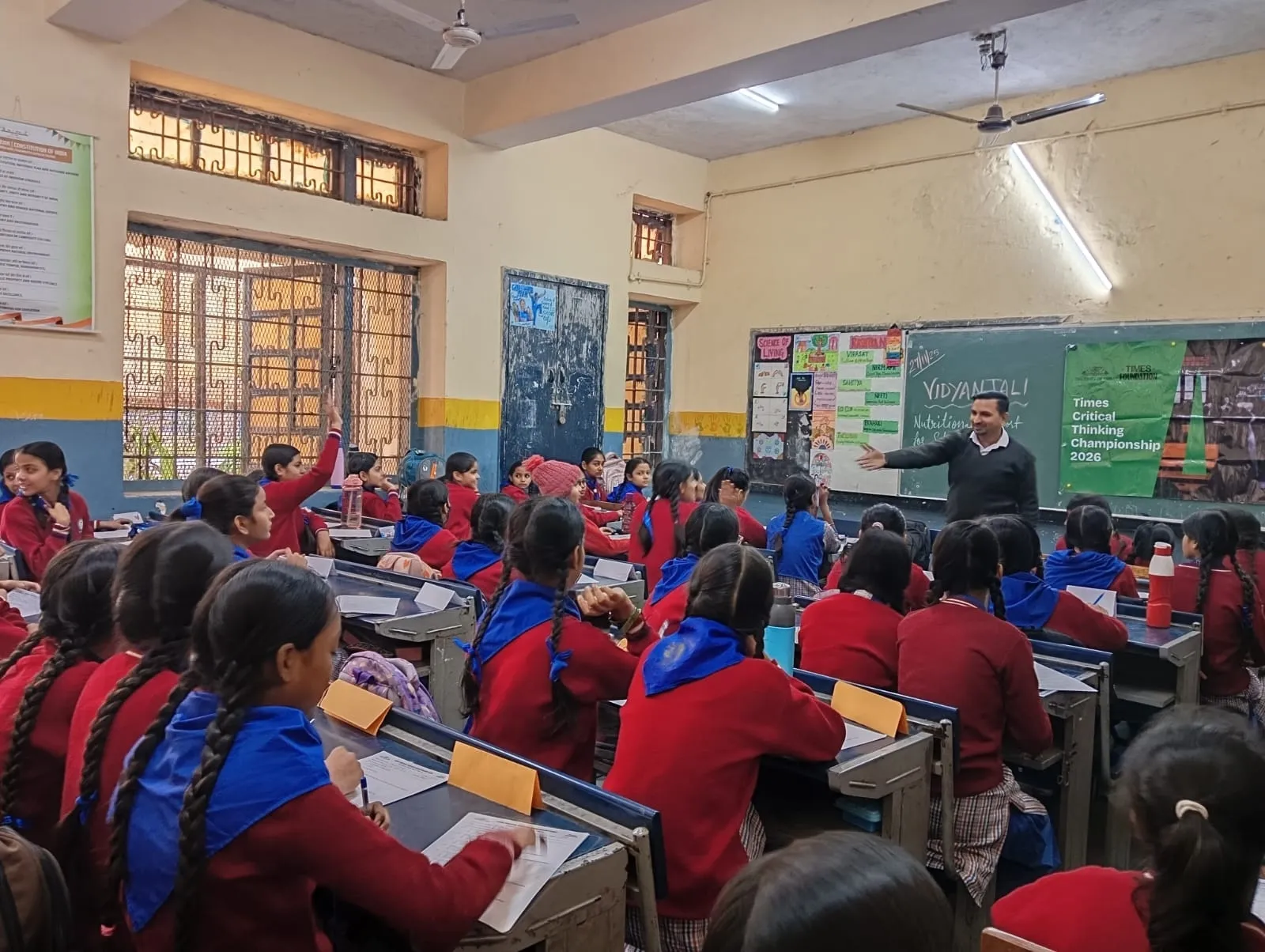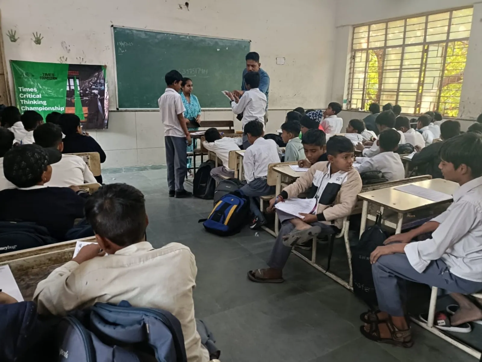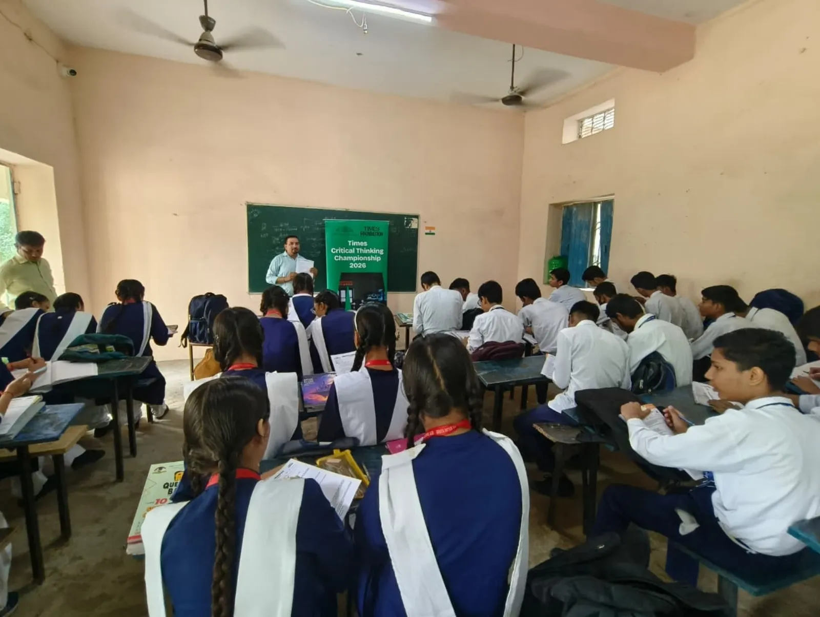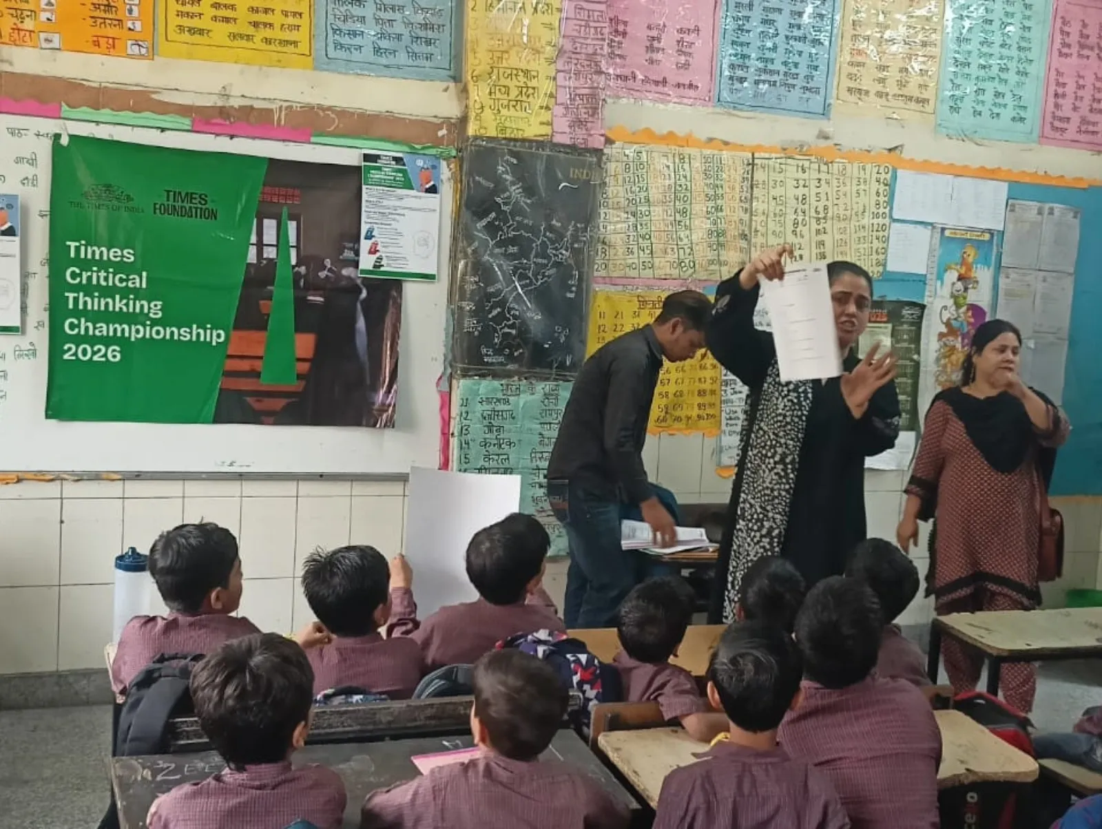 A trainer distributes Times Critical Thinking Championship 2026 quiz papers to students in a government school classroom.