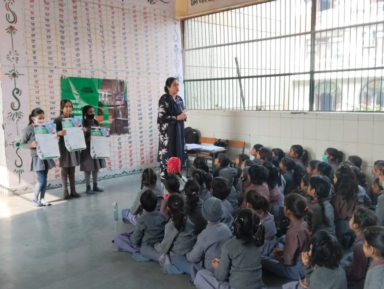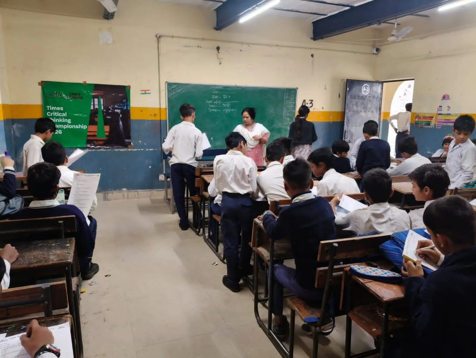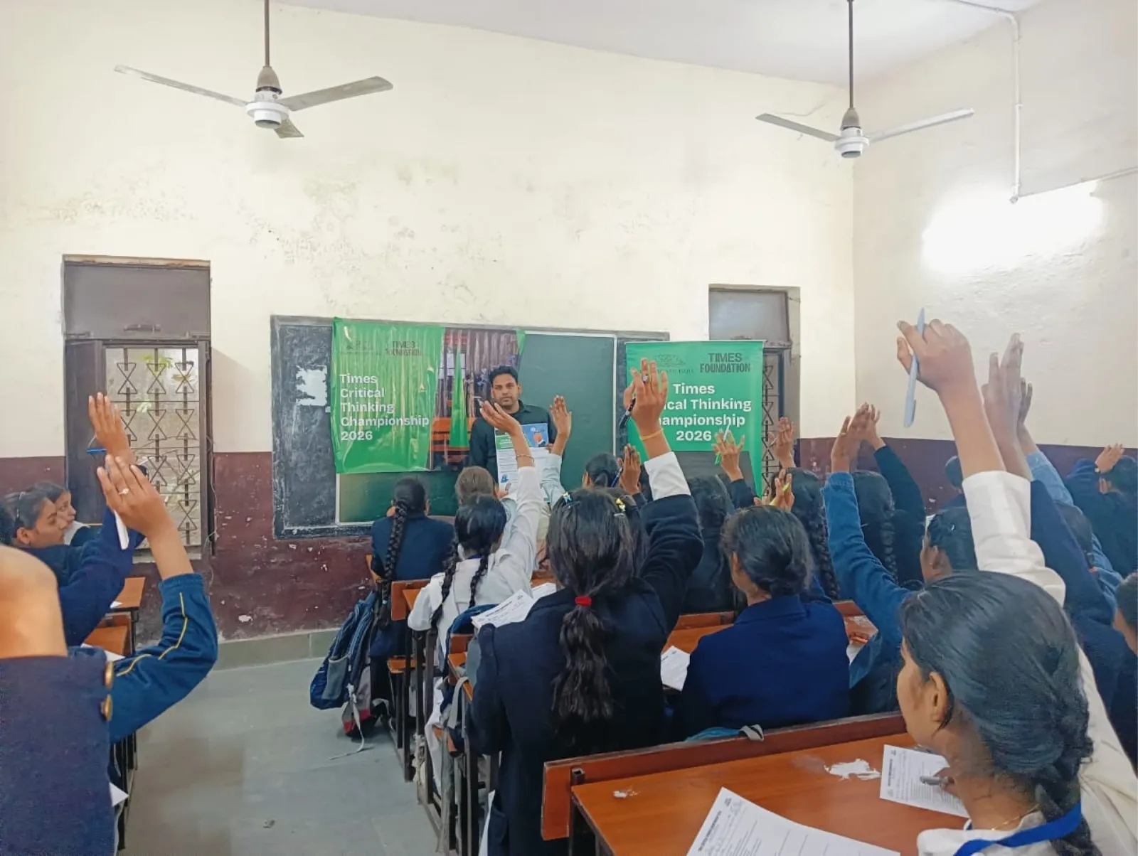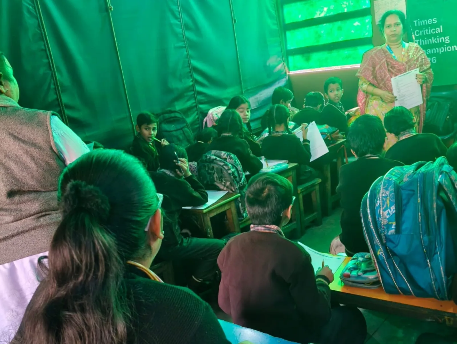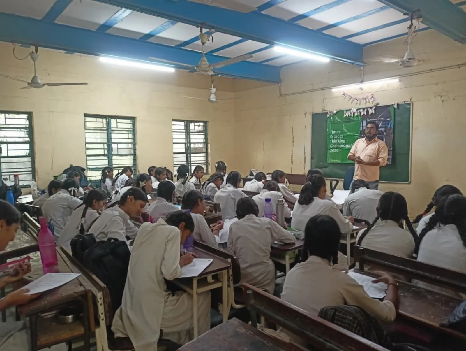 A trainer distributes Times Critical Thinking Championship 2026 quiz papers to students in a government school classroom.
