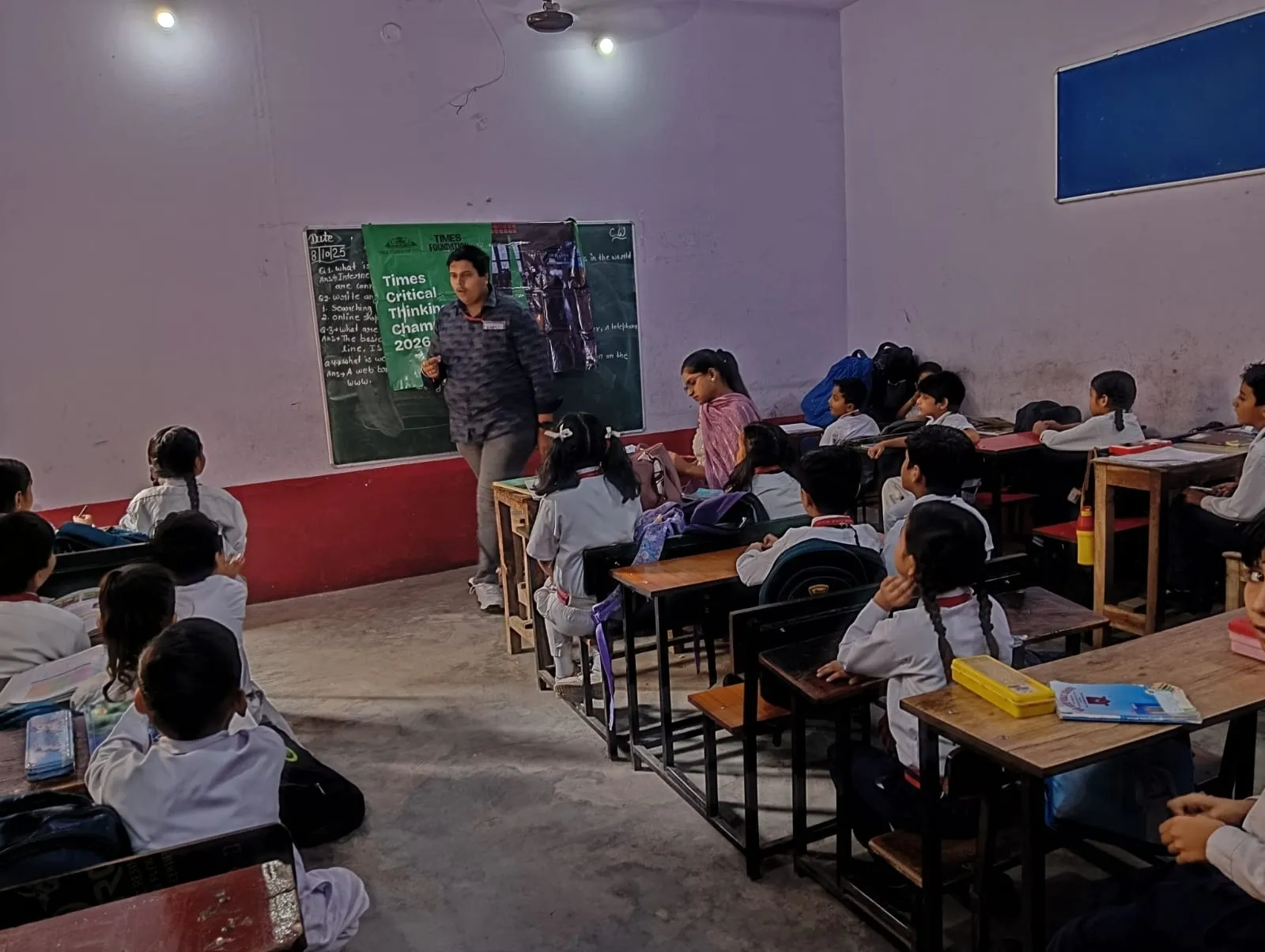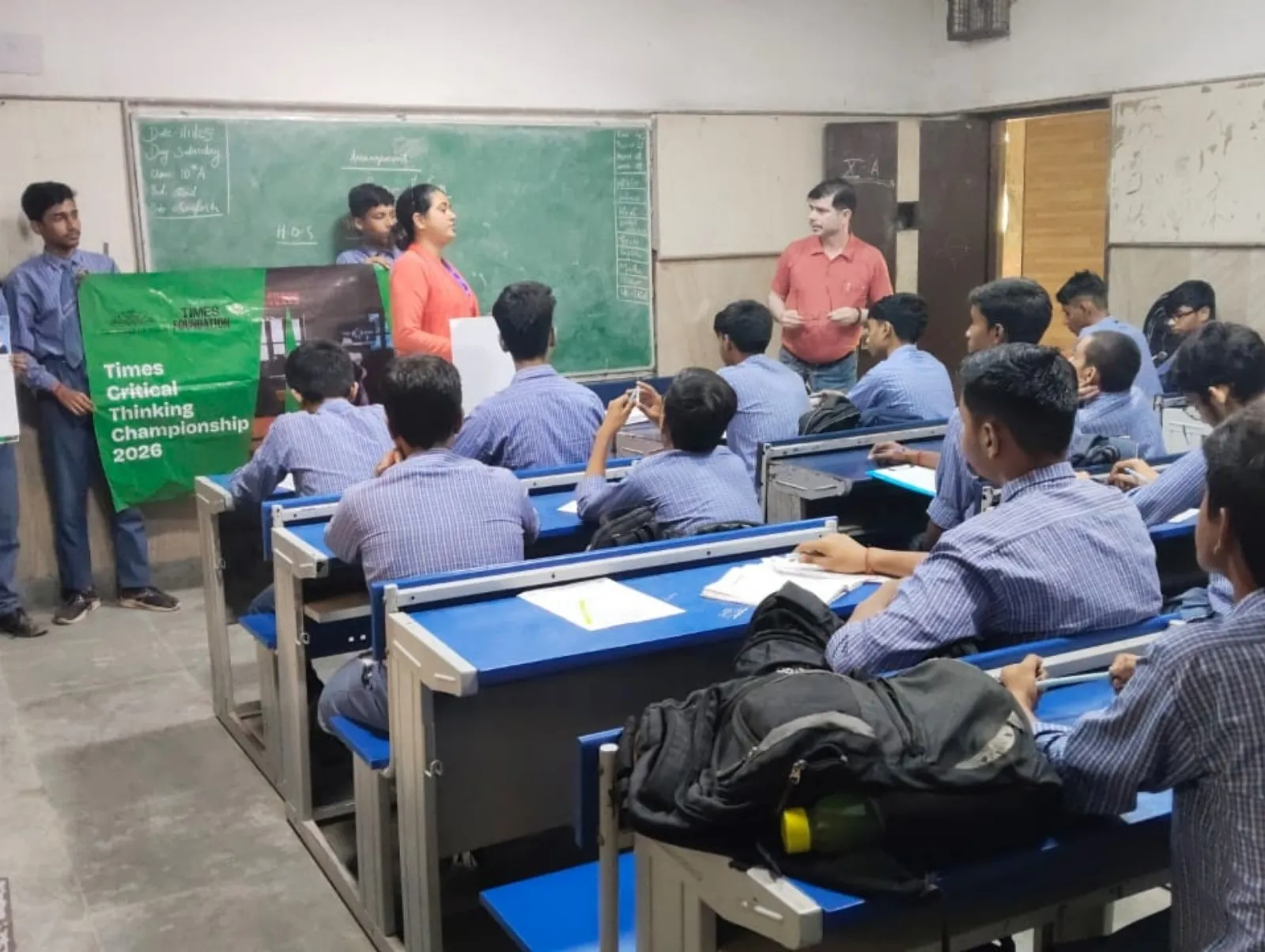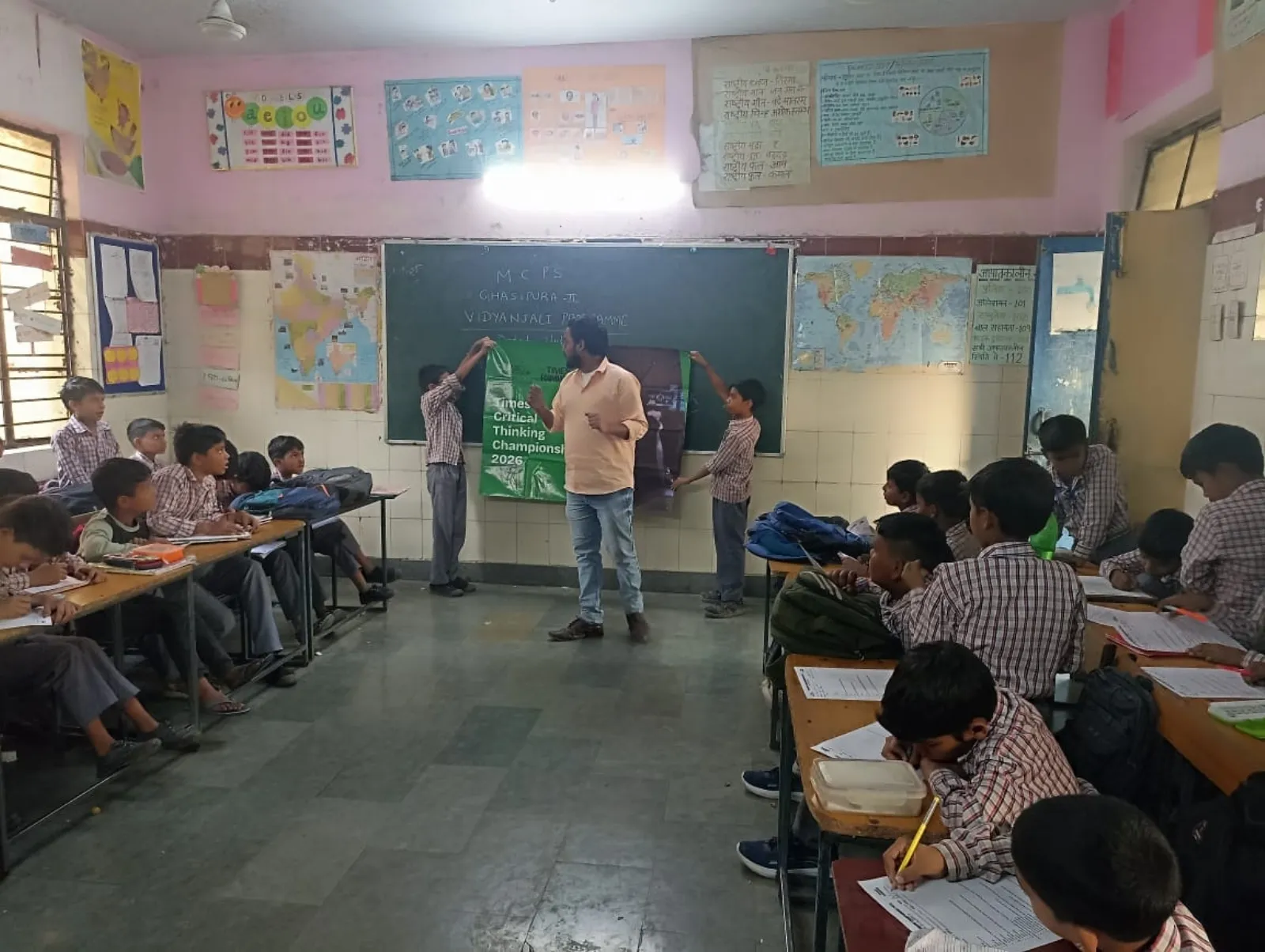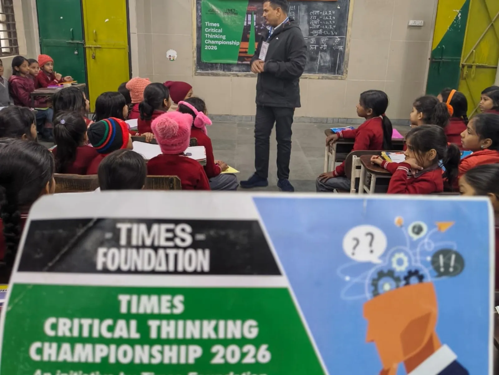 A trainer sets up the Times Critical Thinking Championship 2026 banner in a government school classroom.