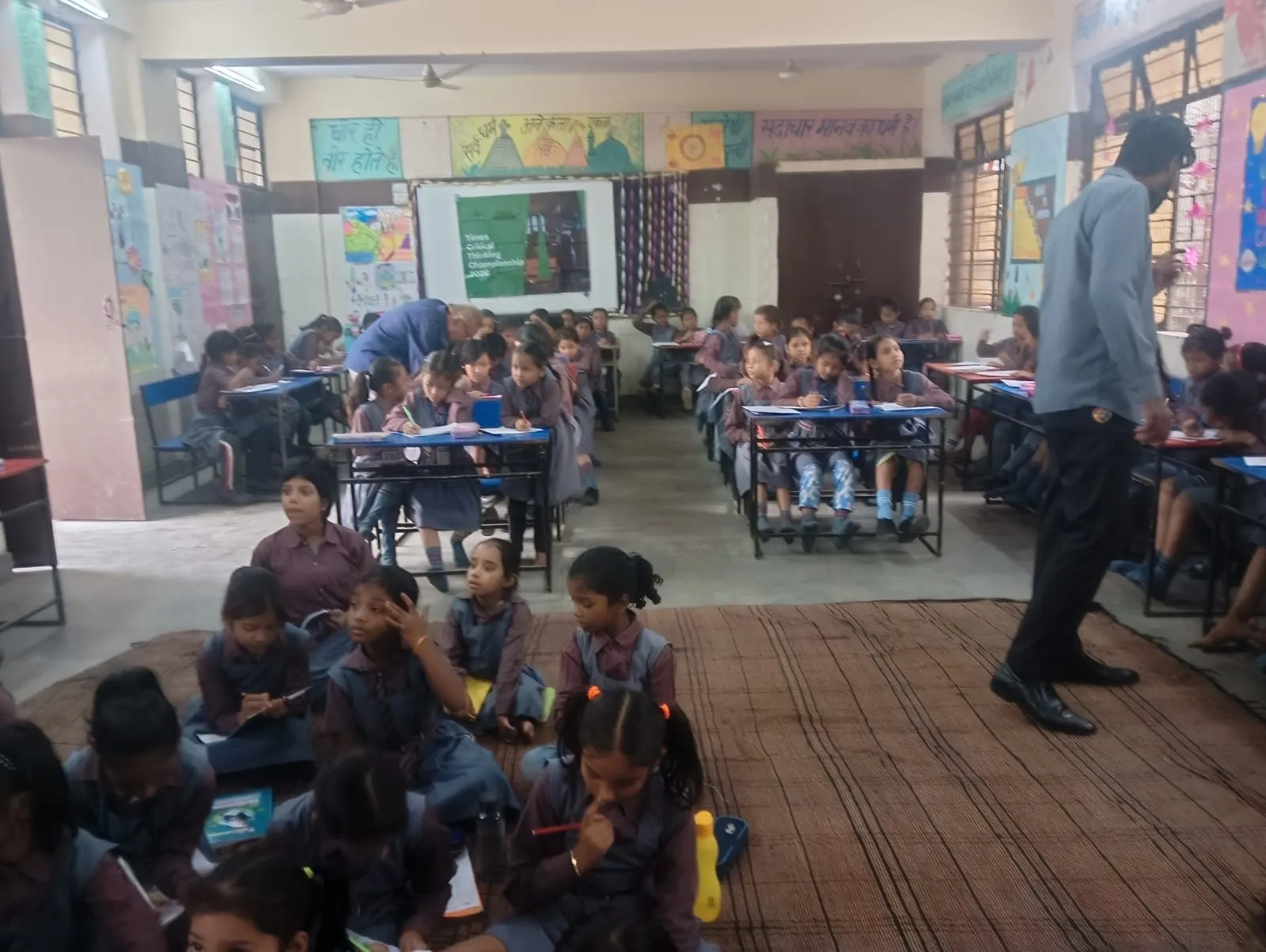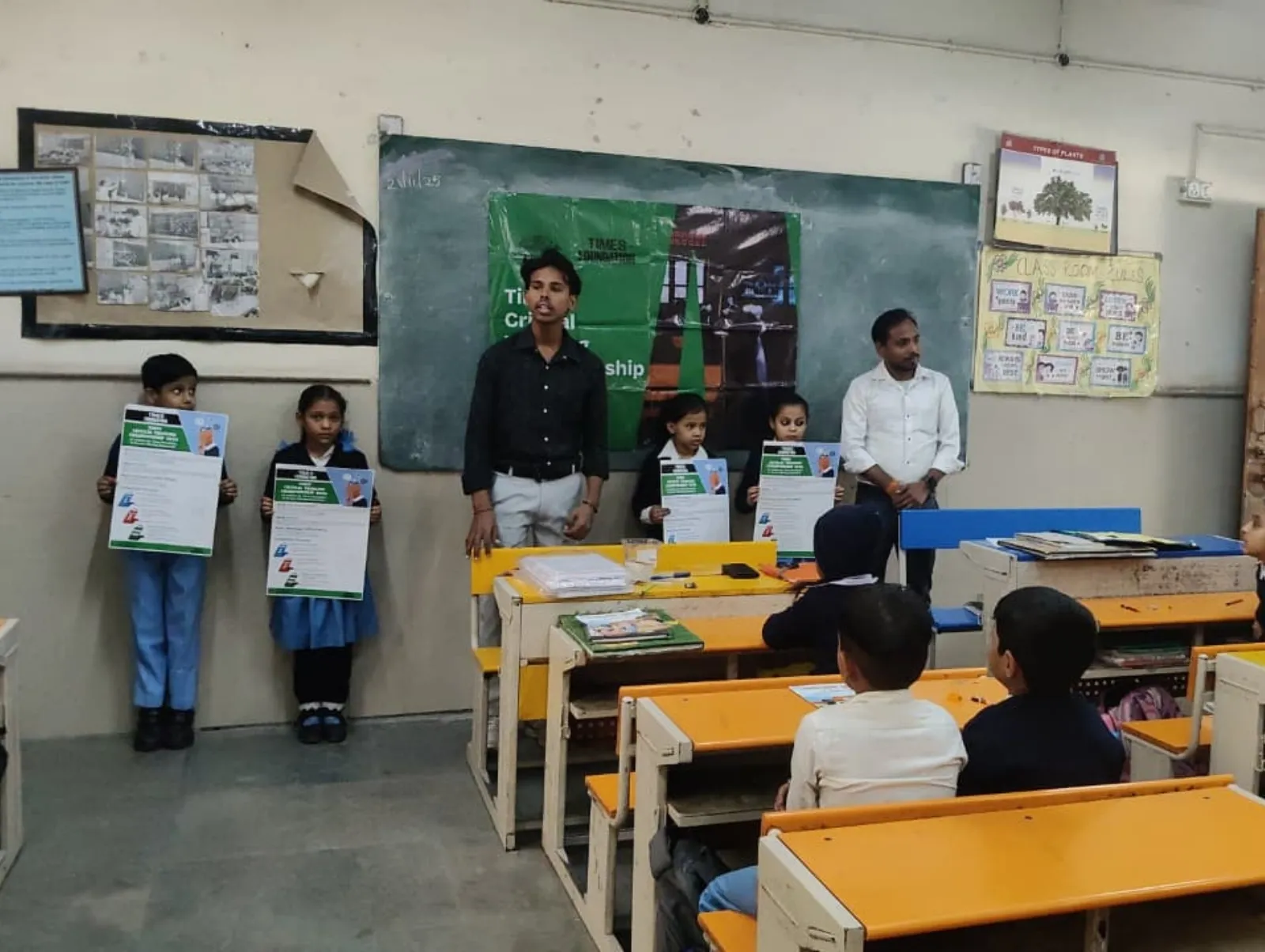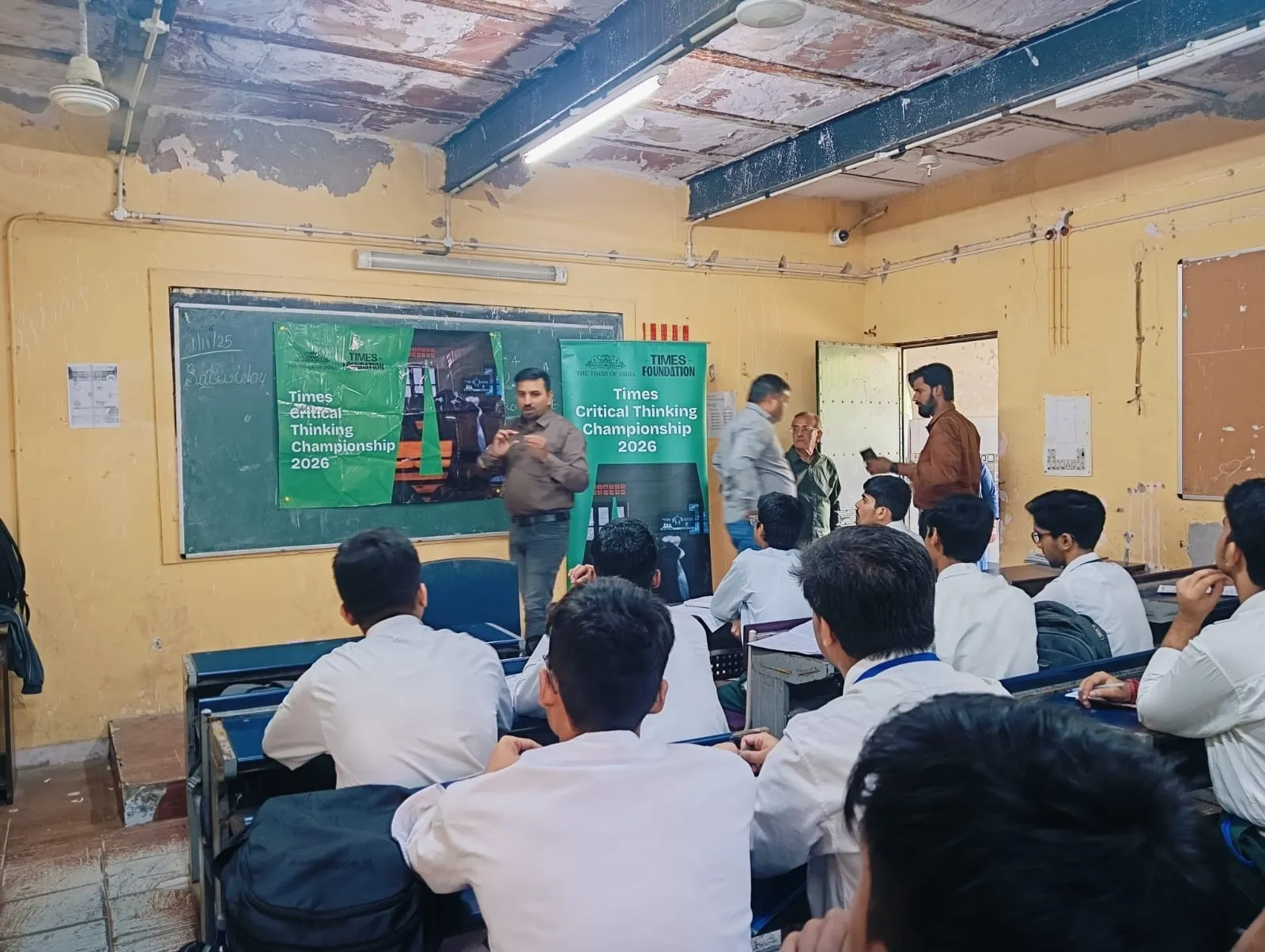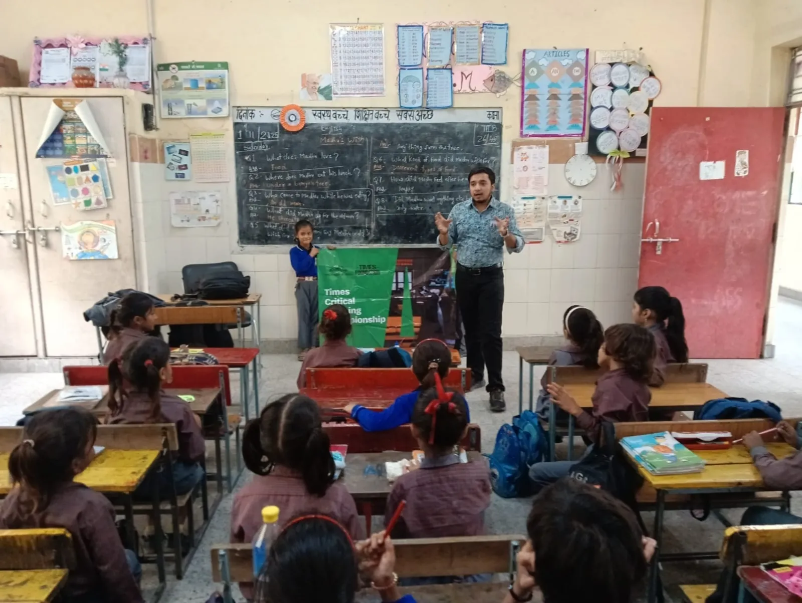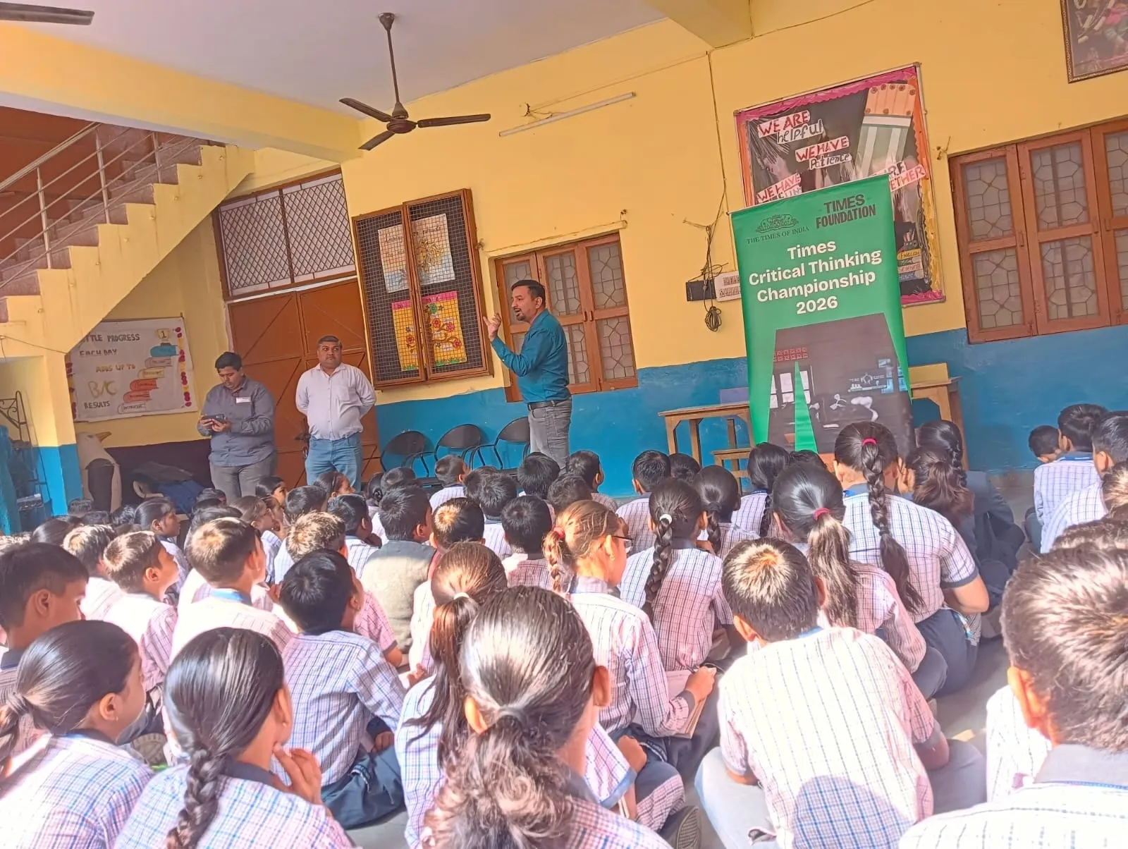 A trainer sets up the Times Critical Thinking Championship 2026 banner in a government school classroom.
