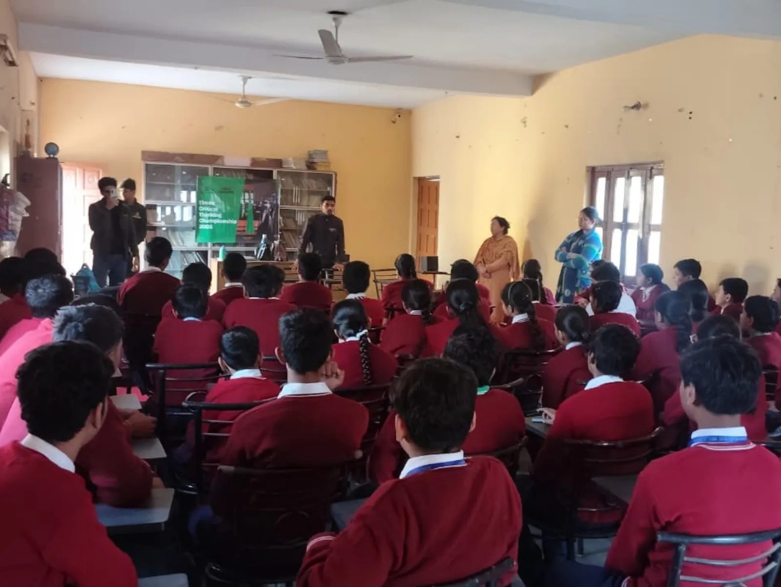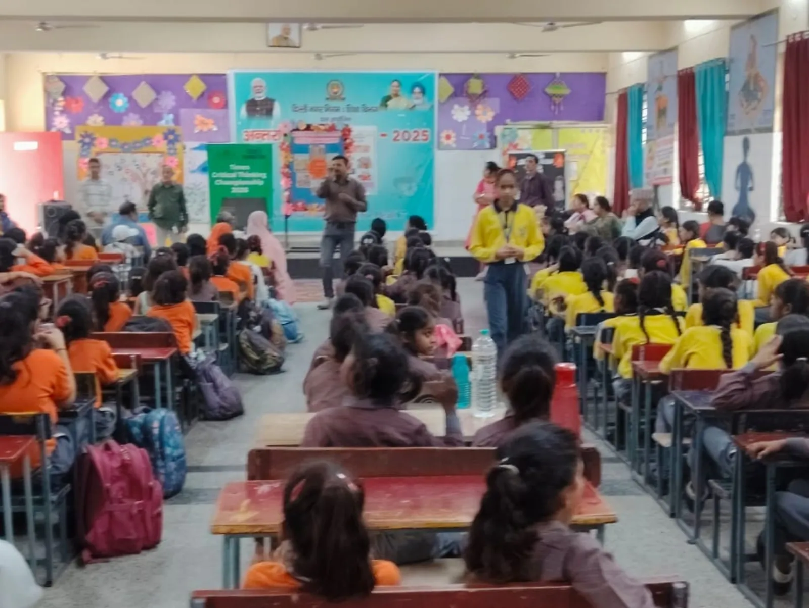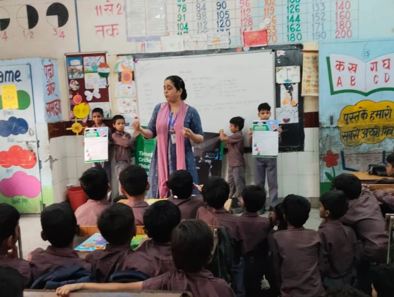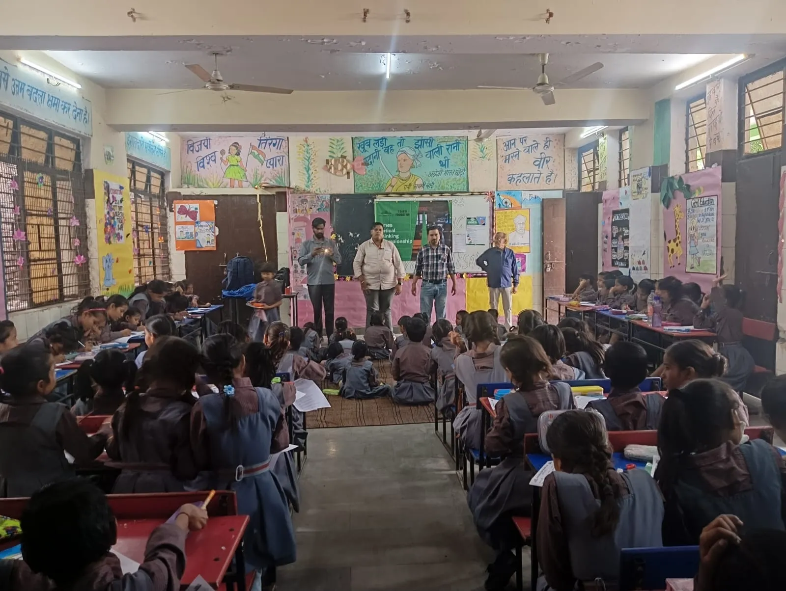 A trainer sets up the Times Critical Thinking Championship 2026 banner in a government school classroom.