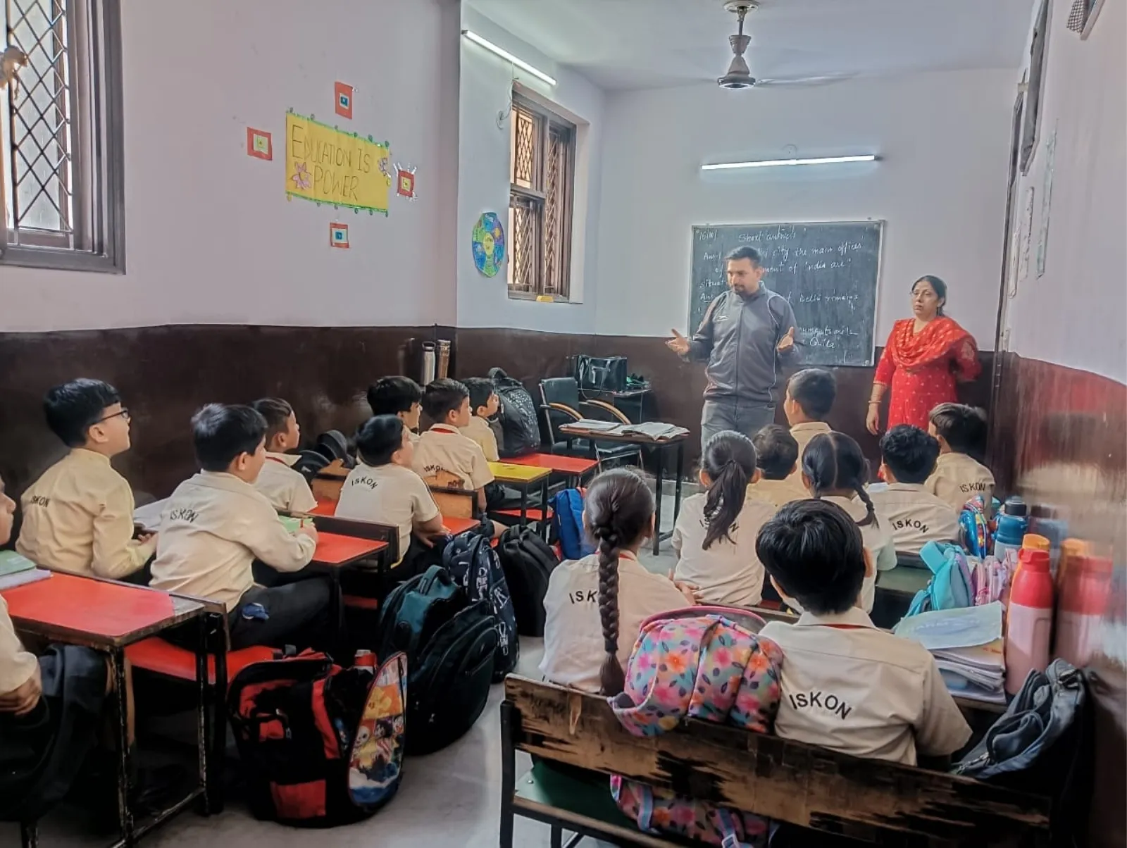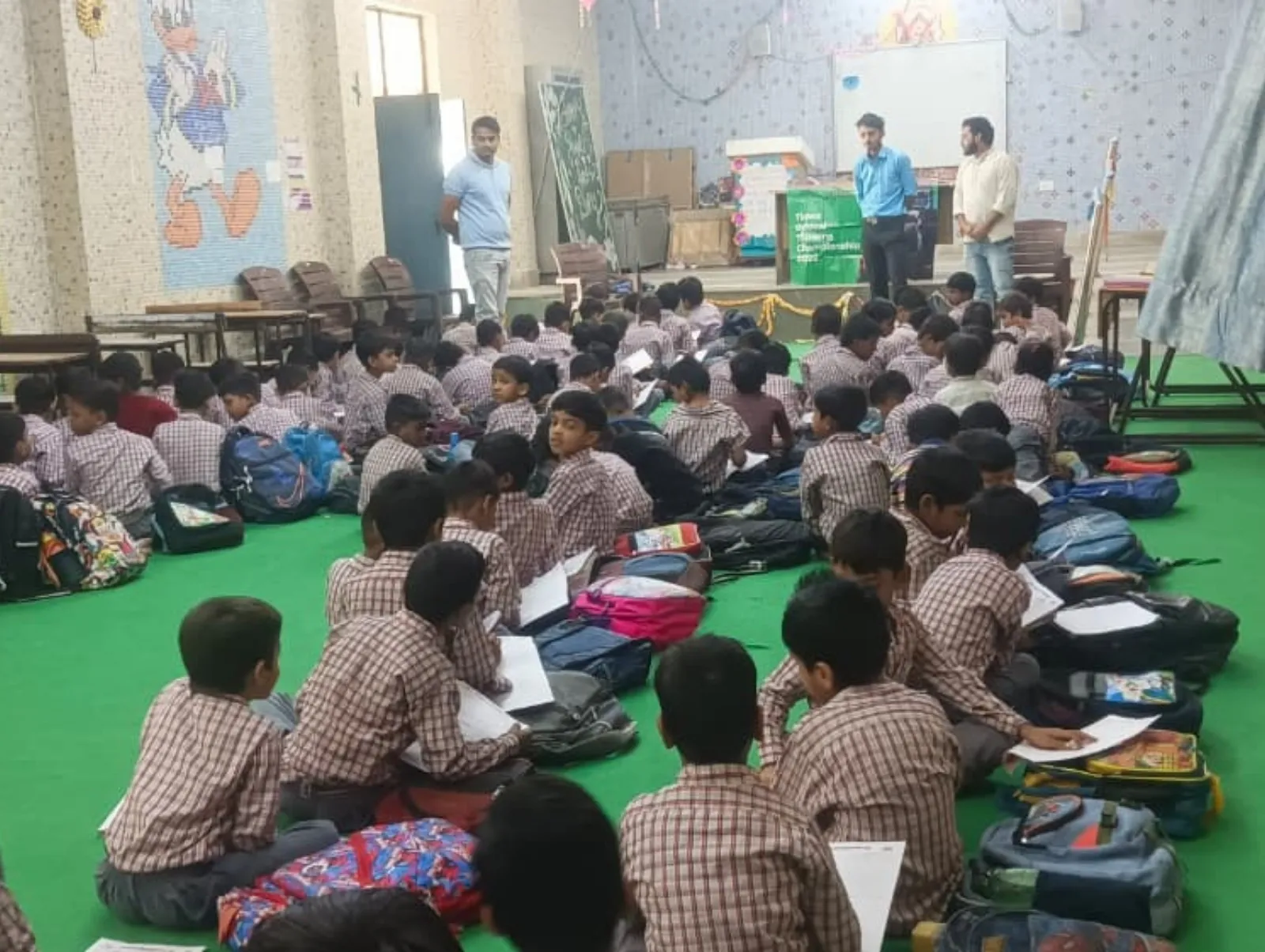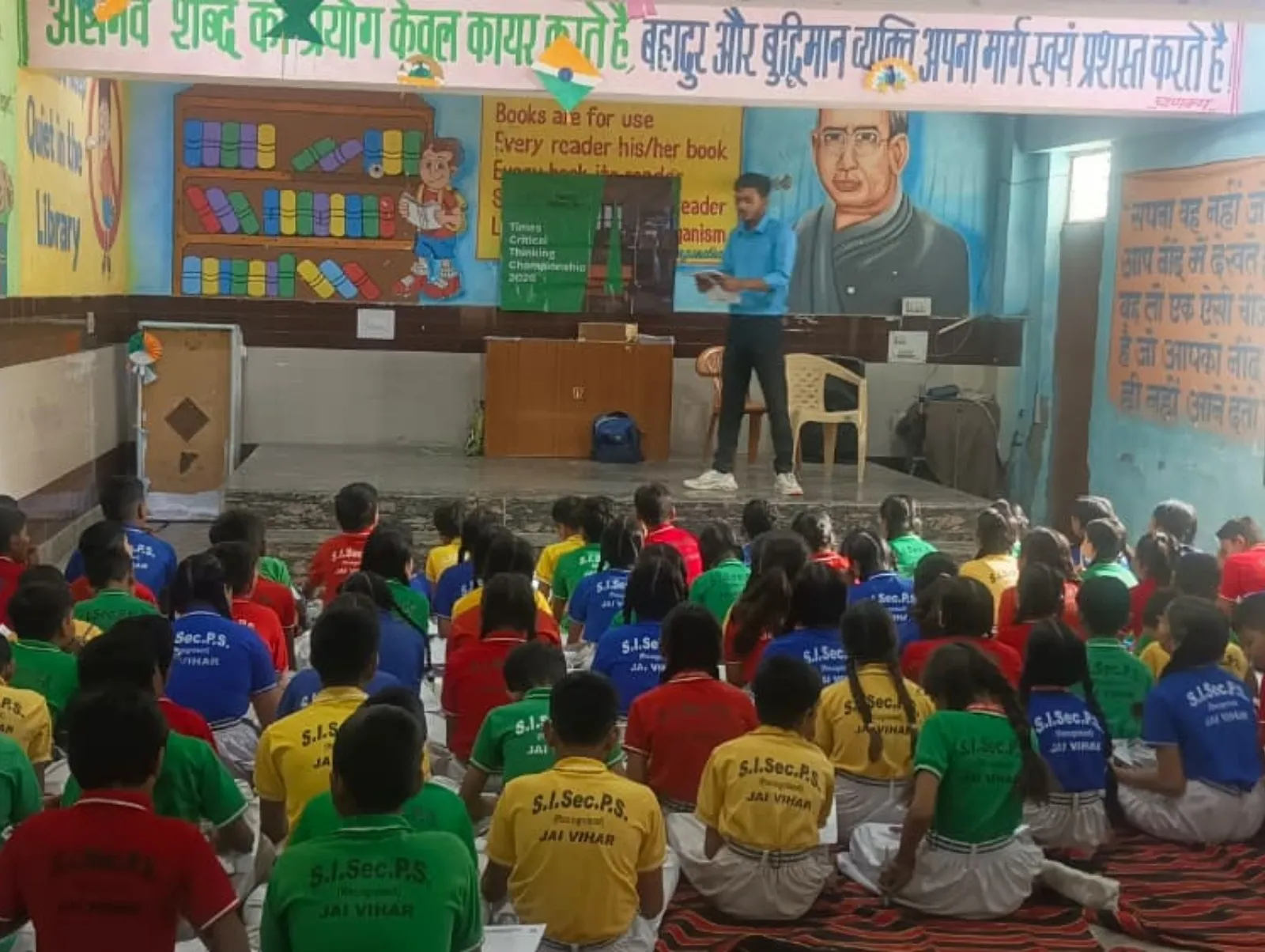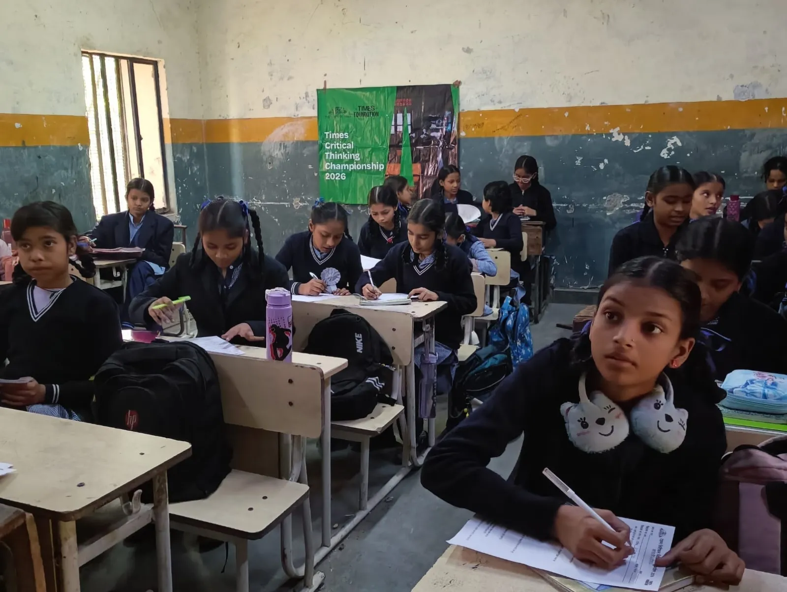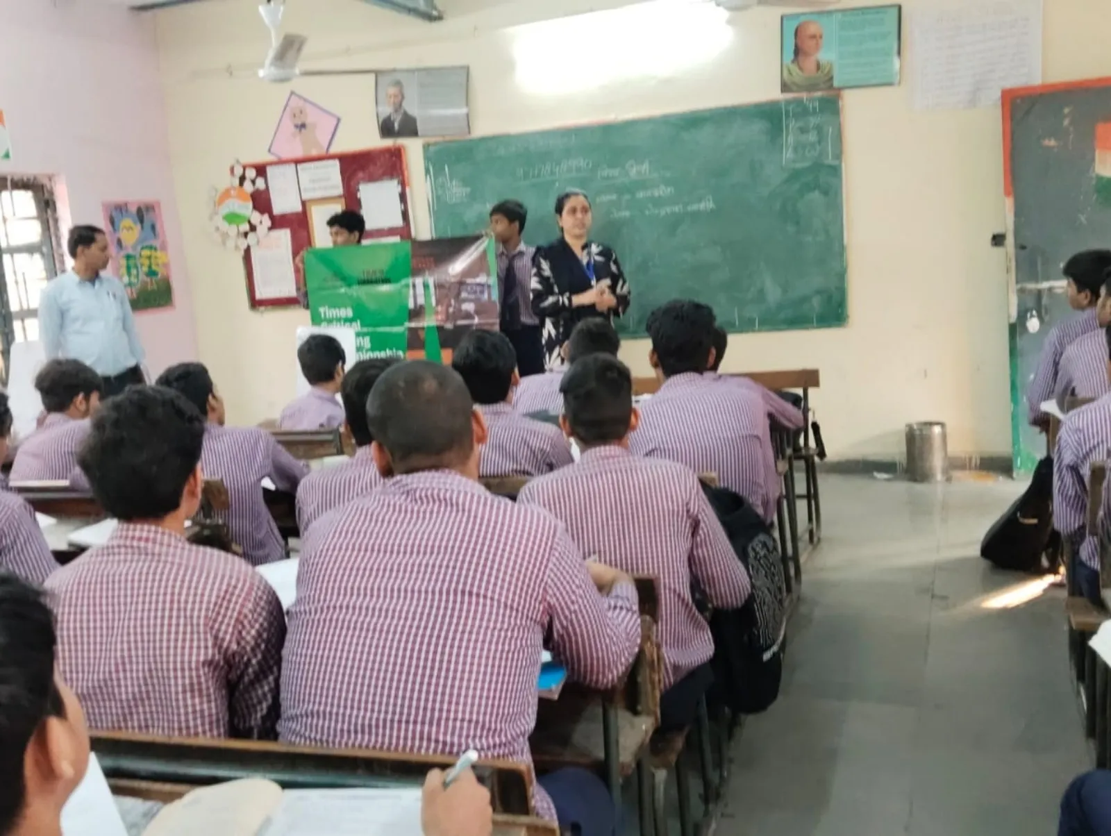 A trainer sets up the Times Critical Thinking Championship 2026 banner in a government school classroom.