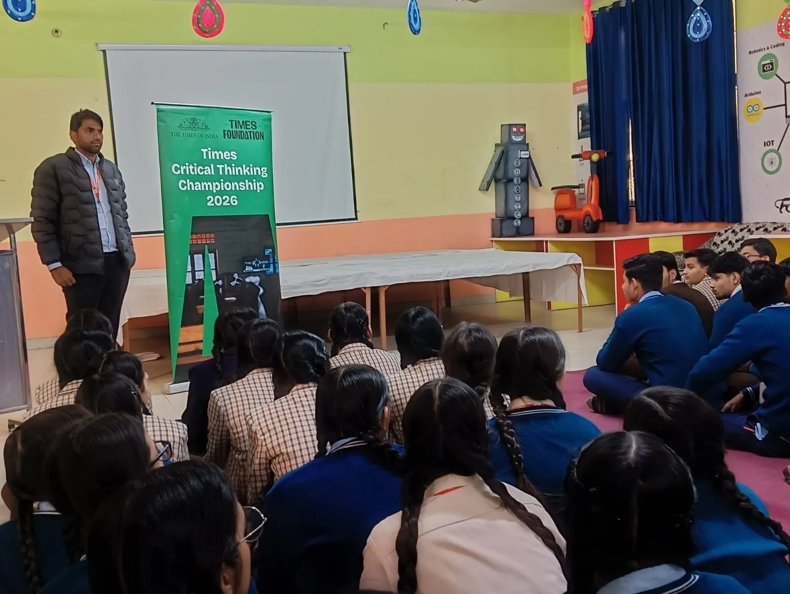 A trainer presents the Times Critical Thinking Championship 2026 in a school robotics lab with students seated on the floor.