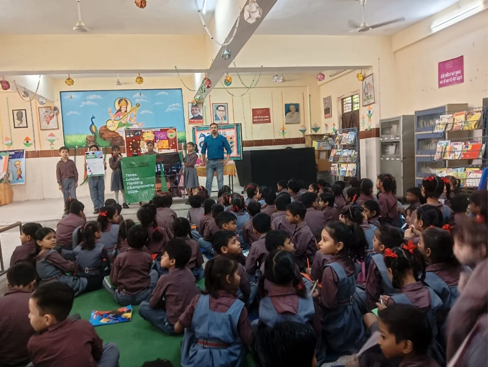 A Times Foundation team presents the Times Critical Thinking Championship 2026 to students in a school library.