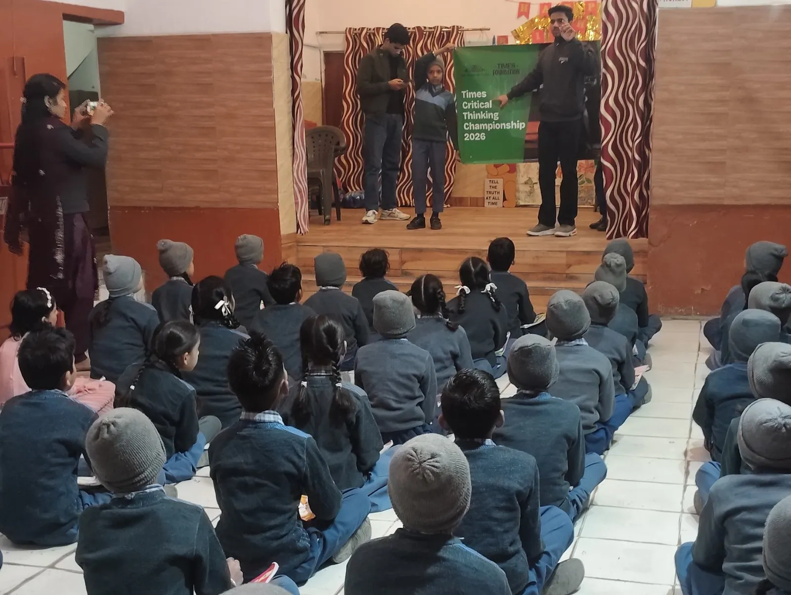 Students participate in a Times Critical Thinking Championship 2026 session in a school hall.