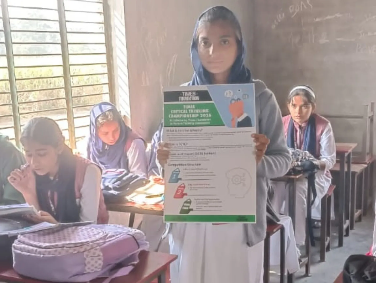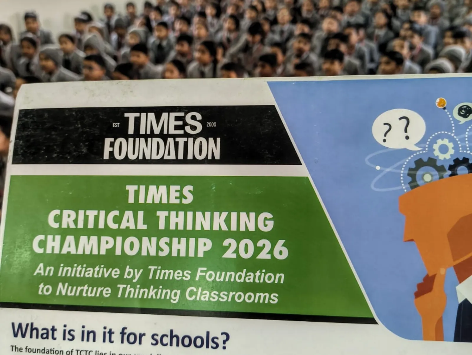 A student holds up a Times Critical Thinking Championship 2026 brochure during a school quiz session.