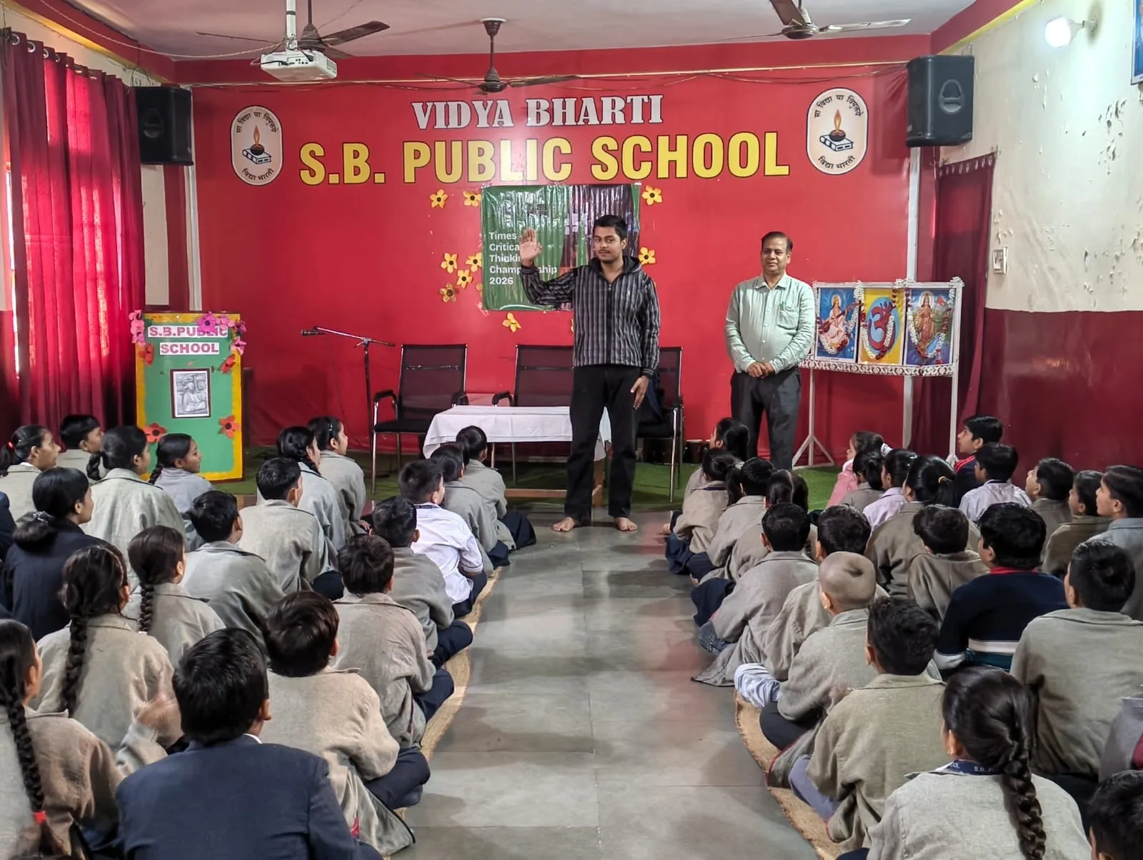 A trainer presents the Times Critical Thinking Championship 2026 to students at Vidya Bharti S.B. Public School.