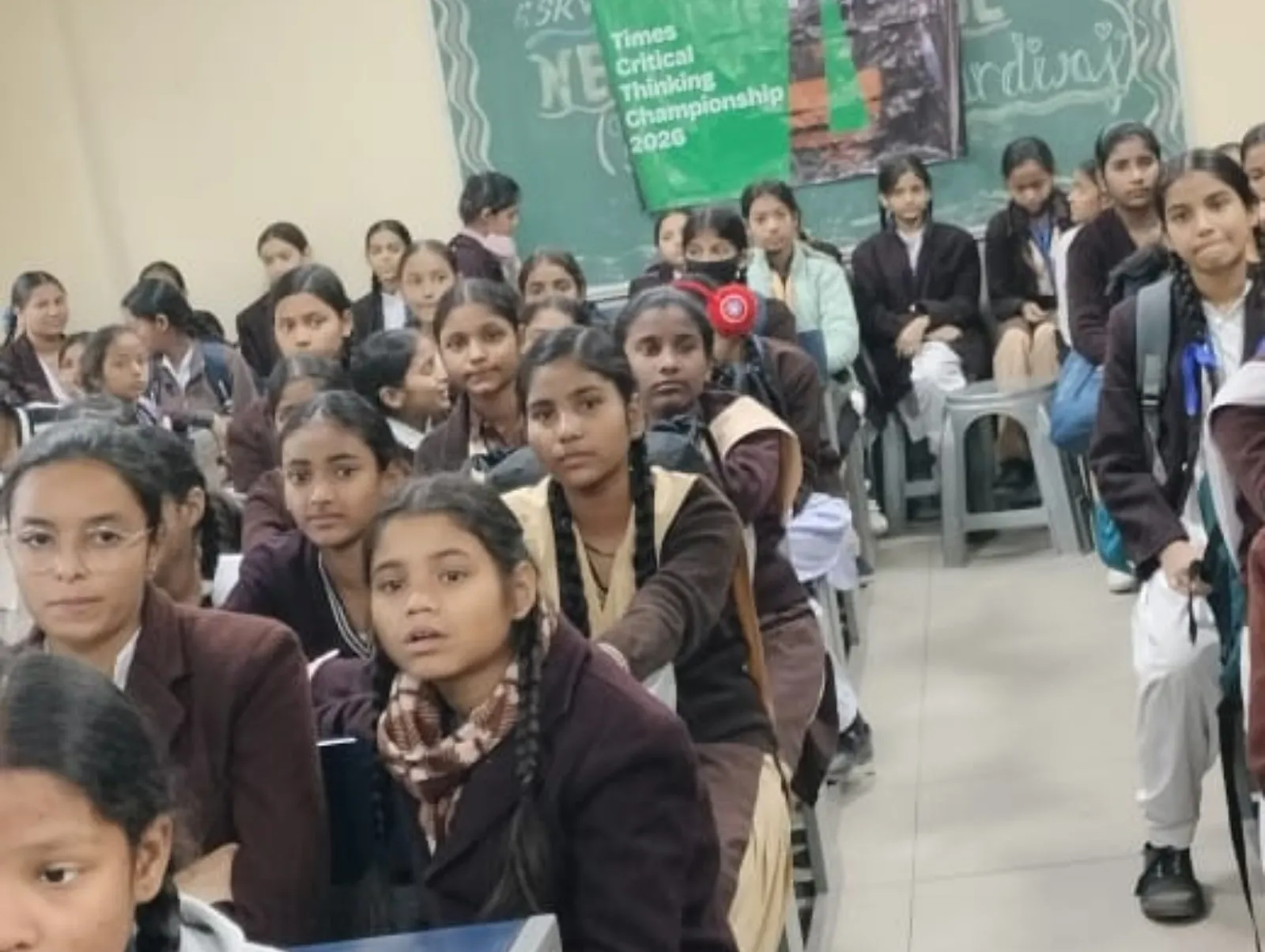 Trainers oversee students taking the Times Critical Thinking Championship 2026 quiz in a packed classroom.