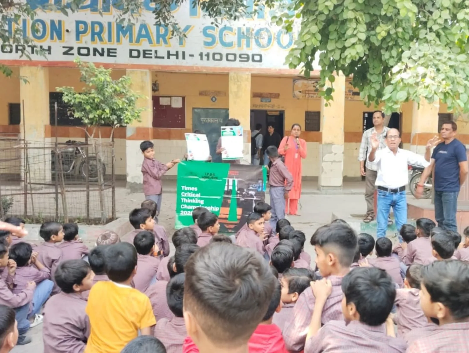 Trainers introduce the Times Critical Thinking Championship 2026 to students at a primary school outdoor assembly.