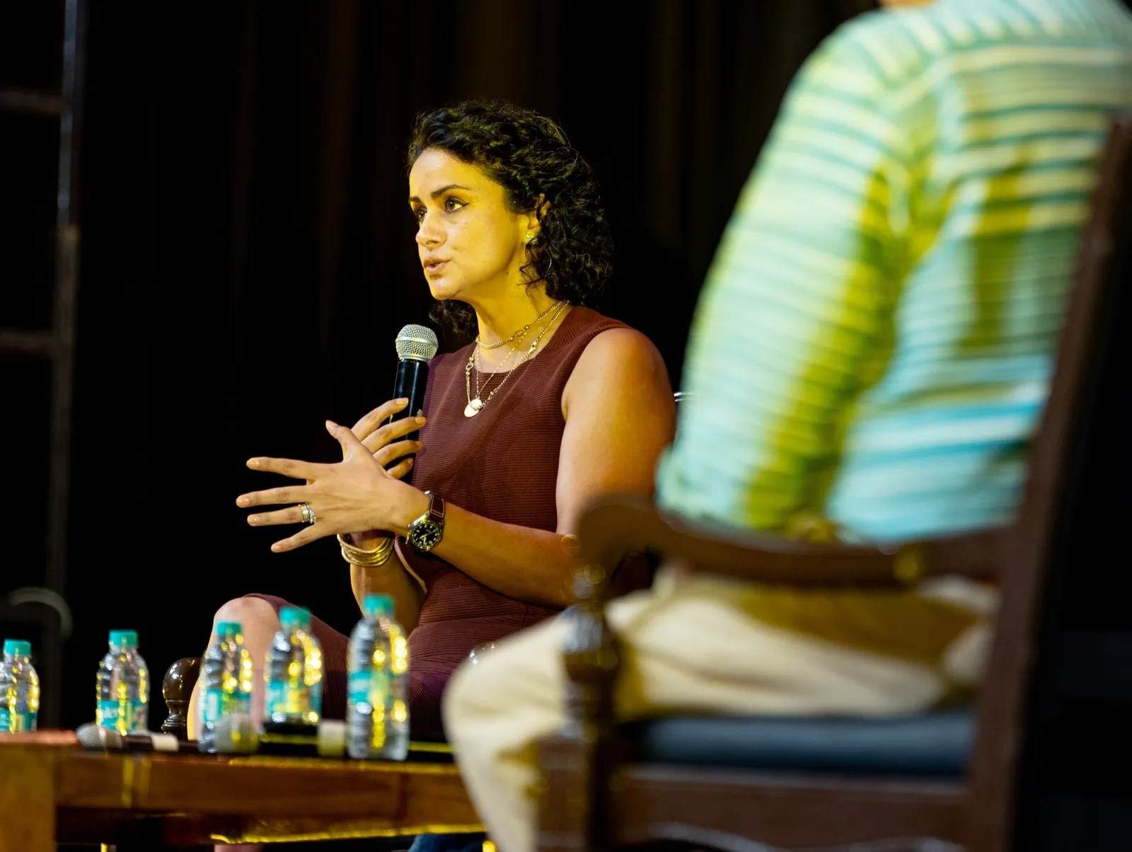 A speaker addresses the audience at the Times Critical Thinking Championship grand event.