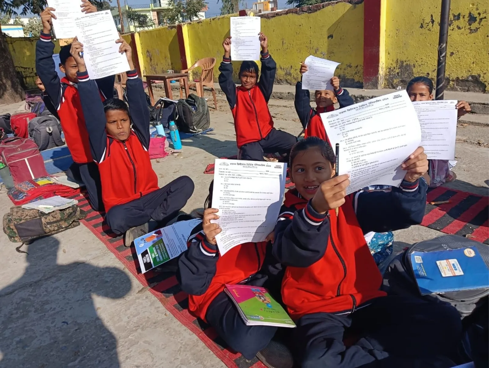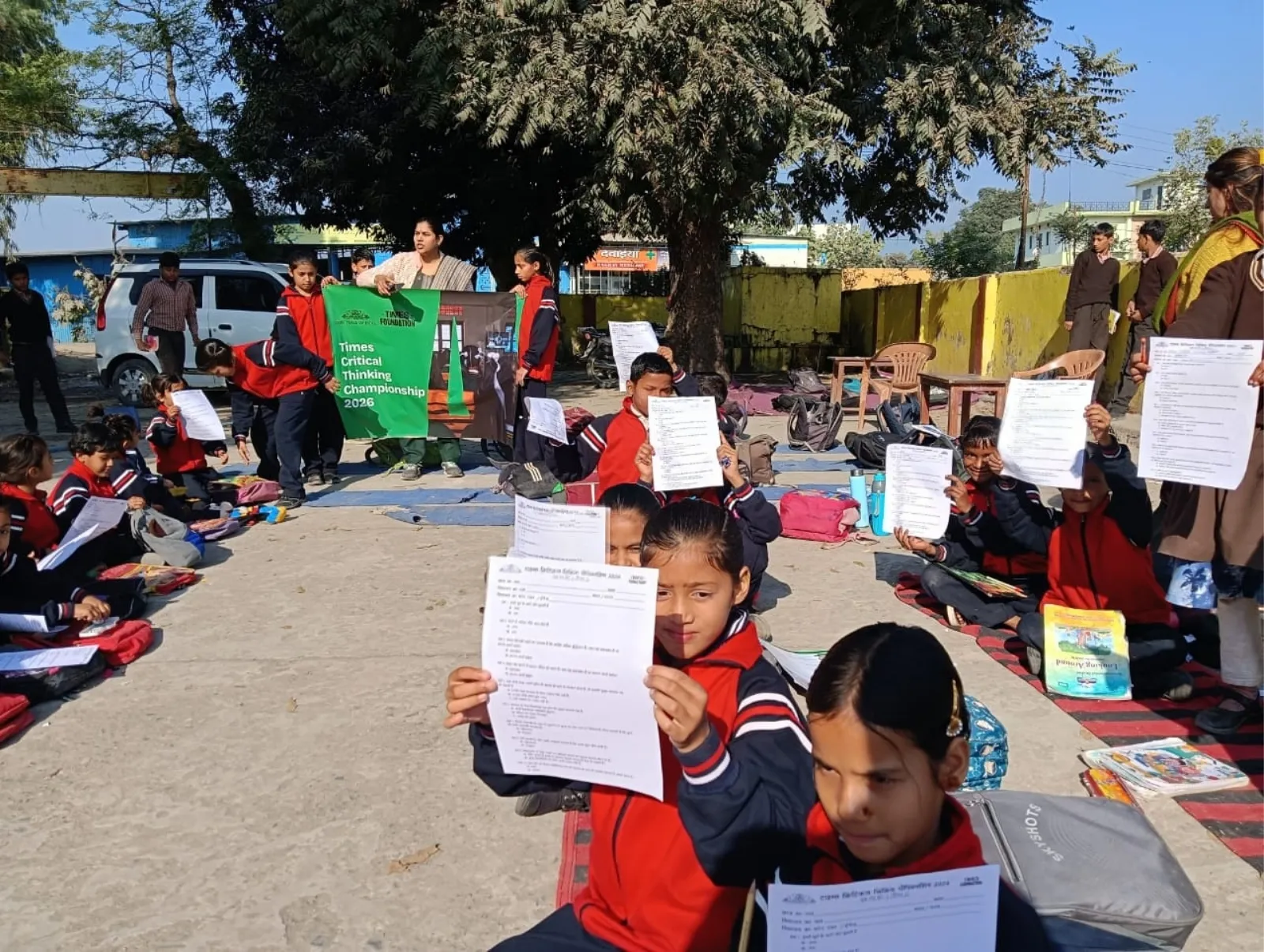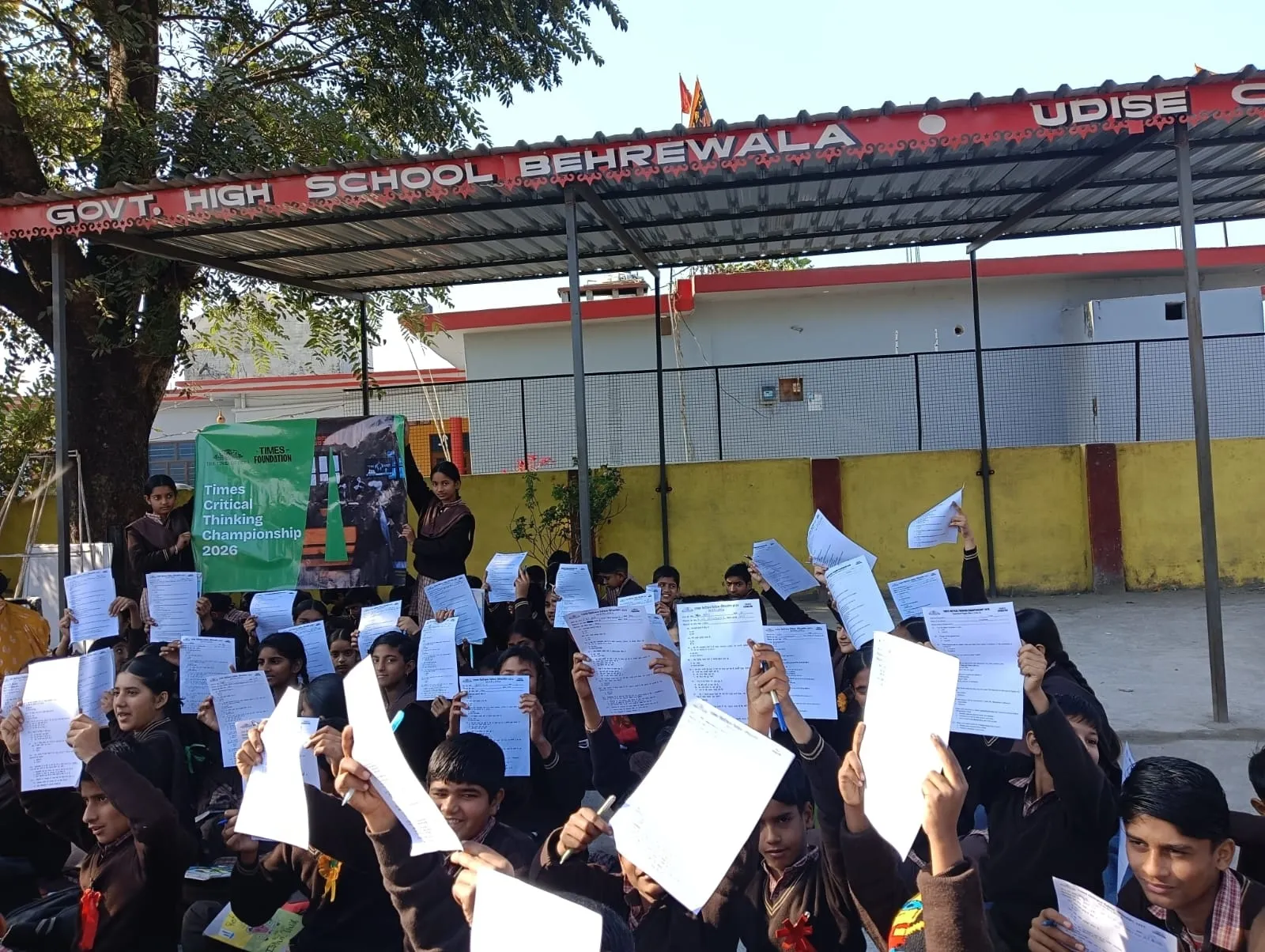 Students at Govt. High School Behrewala hold up their Times Critical Thinking Championship 2026 quiz sheets.